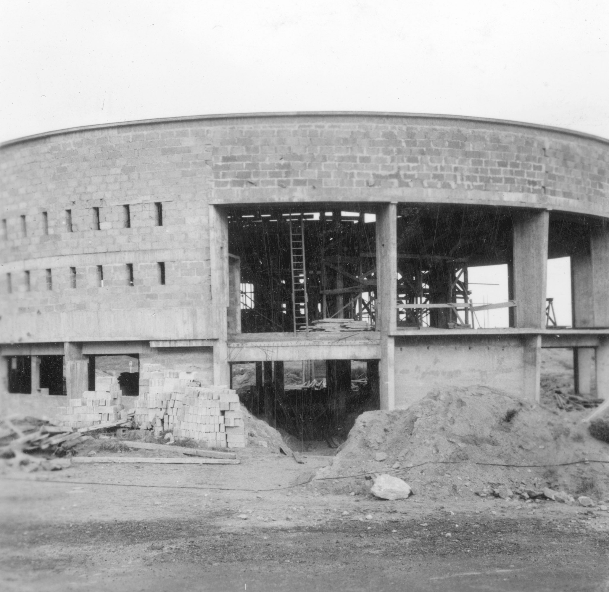 Reconstruction du casino. Rotonde, vue partielle prise de l'est.- Photographie ancienne, n.s., 6 décembre 1956, [date manuscrite]. Tirage original sur papier brillant contrecollé sur carton, n. et b., 6,2 x 6,2 cm. (AC Ouistreham).Immatriculation