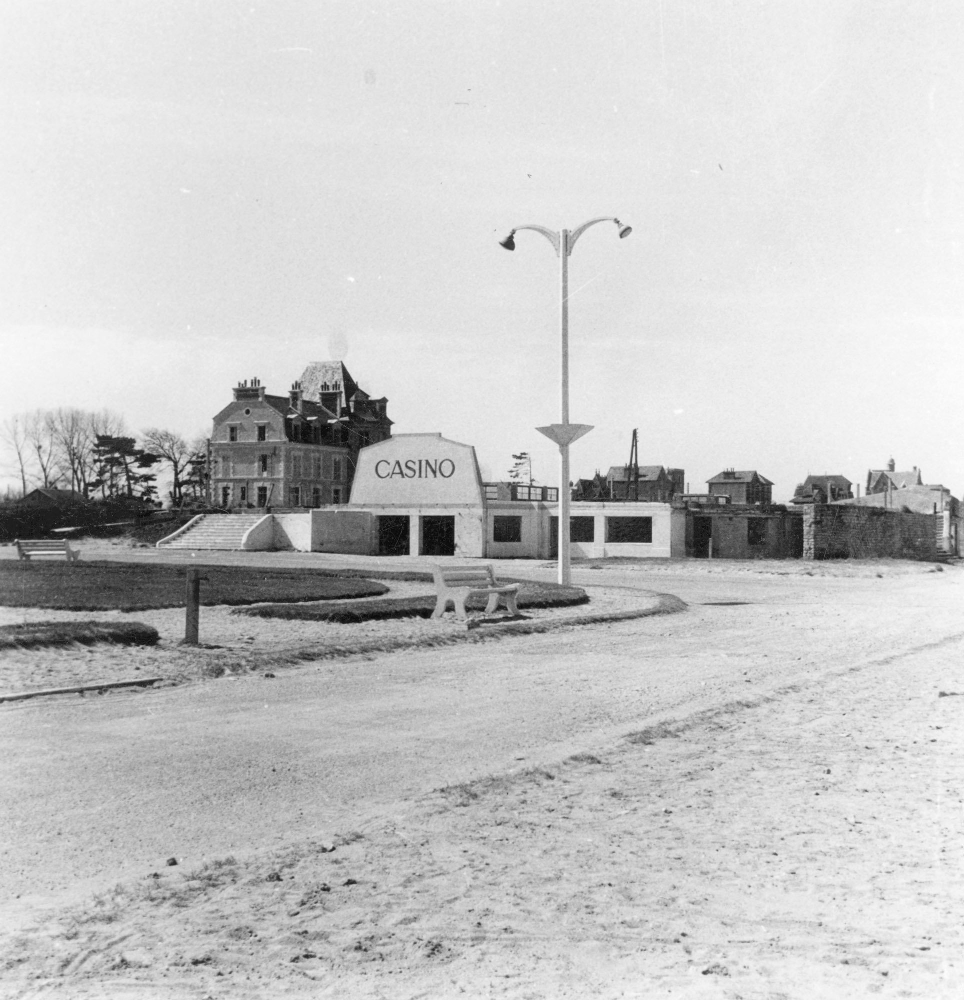 2ème casino dit le Casino Municipal : vue du casino après la Seconde Guerre mondiale.- Photographie ancienne, n.s., n.d., entre 1945 et 1955. Tirage original sur papier brillant, n. et b., 9 x 9 cm. (AC Ouistreham).Immatriculation