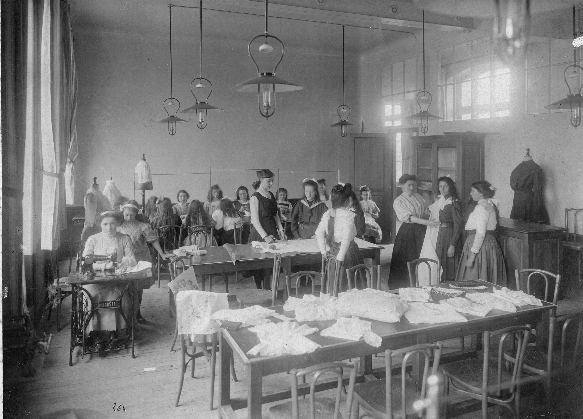 Leçon de couture.- Photographie ancienne de Cartois G. (photographe), vers 1900-1924. (Bibliothèque municipale, Cherbourg-Octeville. Boîte n° 8).Immatriculation