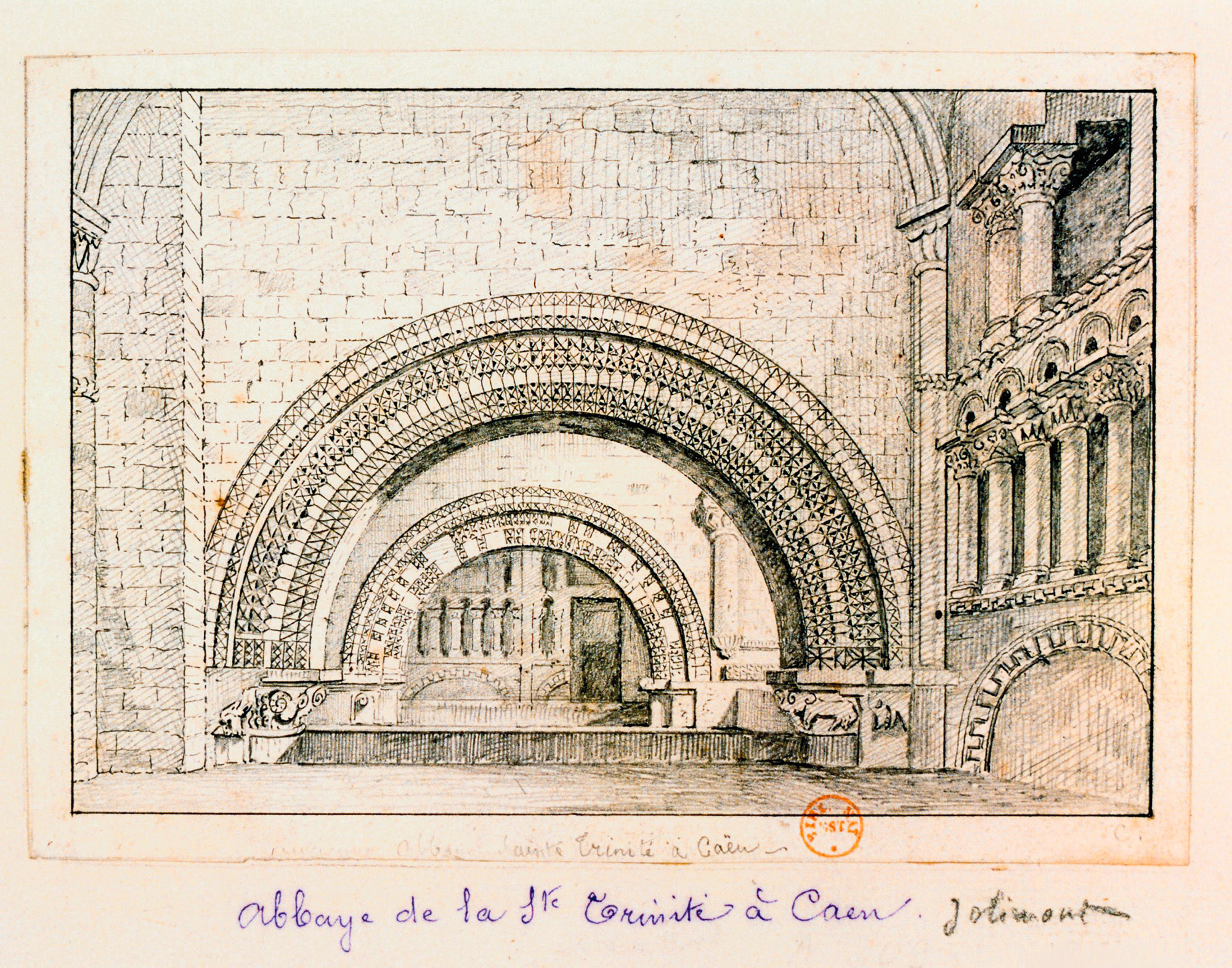 Arc fourré portant un décor de bâtons brisés marquant l'entrée du bras est du transept entresolé.- Dessin à la mine de plomb, plume et encre de Chine, Théodore de Jolimont, 19e siècle. (Bibliothèque nationale de France, département des Estampes. VE-26(H)-FOL).Immatriculation