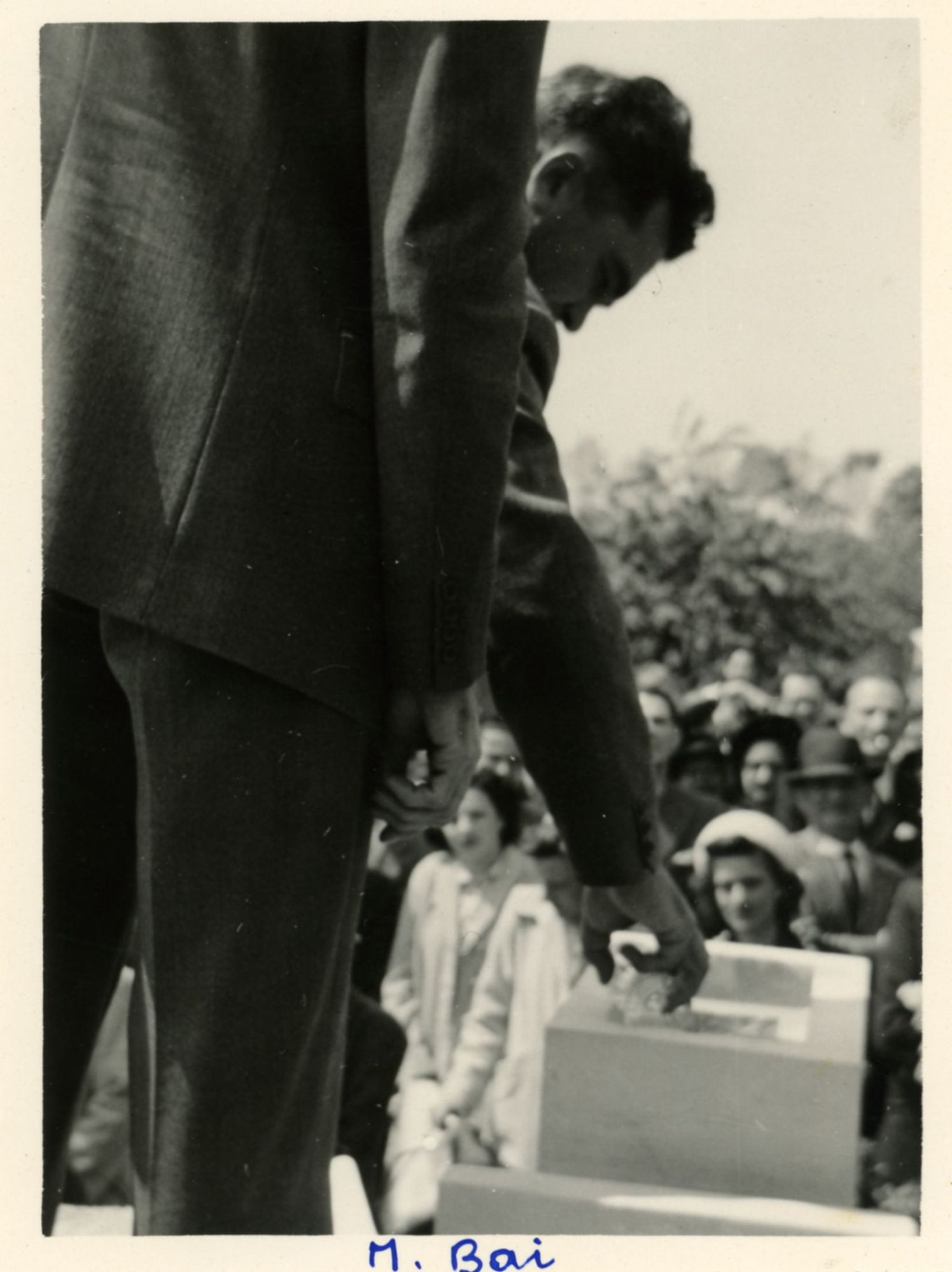 Pose de la première pierre : M. Bai.- Photographie ancienne, album privé de Louis Bai.Immatriculation