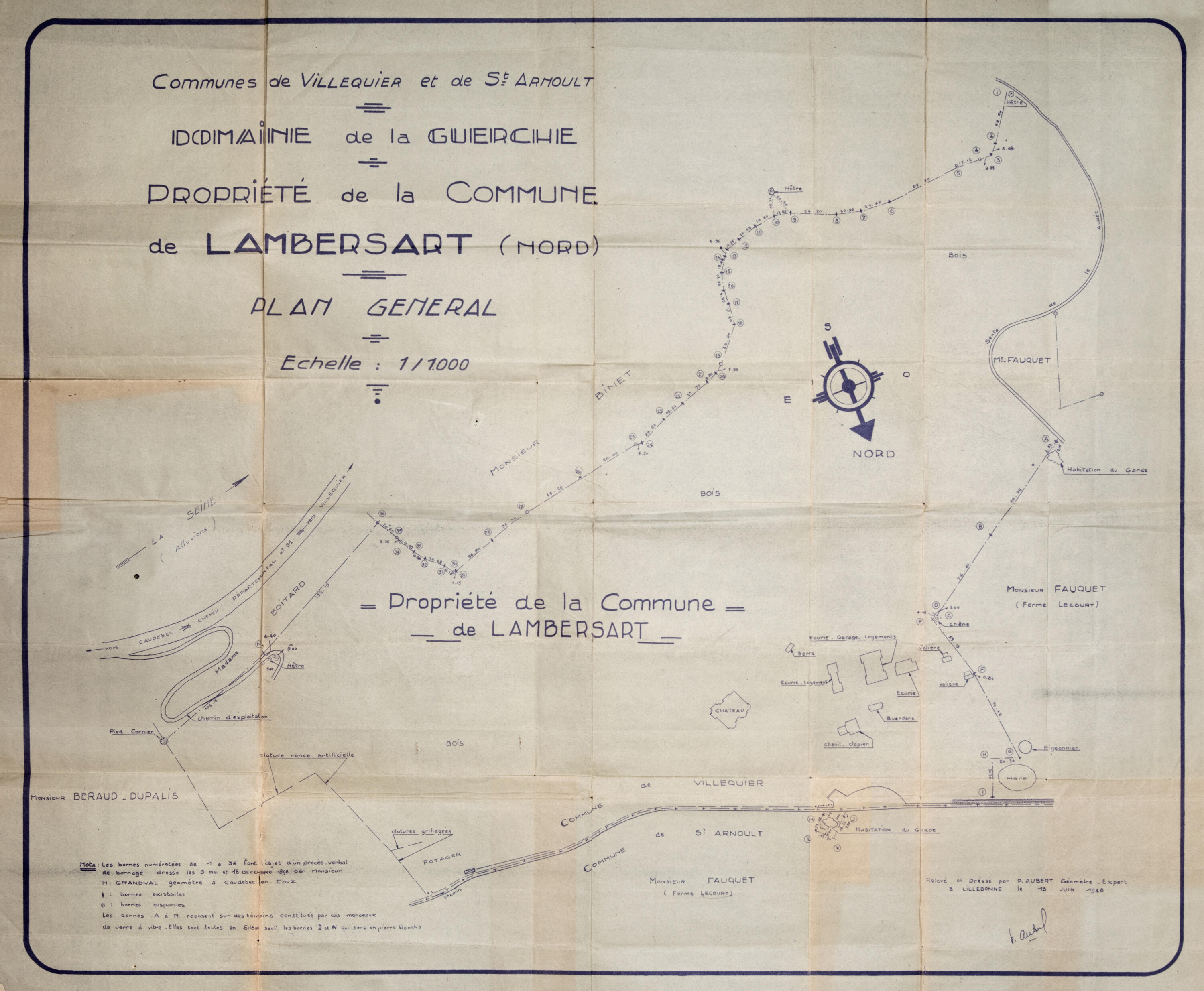 Domaine de La Guerche, propriété de la commune de Lambersart (Nord).- Plan général au 1/1000, P. Aubert, géomètre expert, Lillebonne, 15 juin 1946 (Collection particulière).Immatriculation