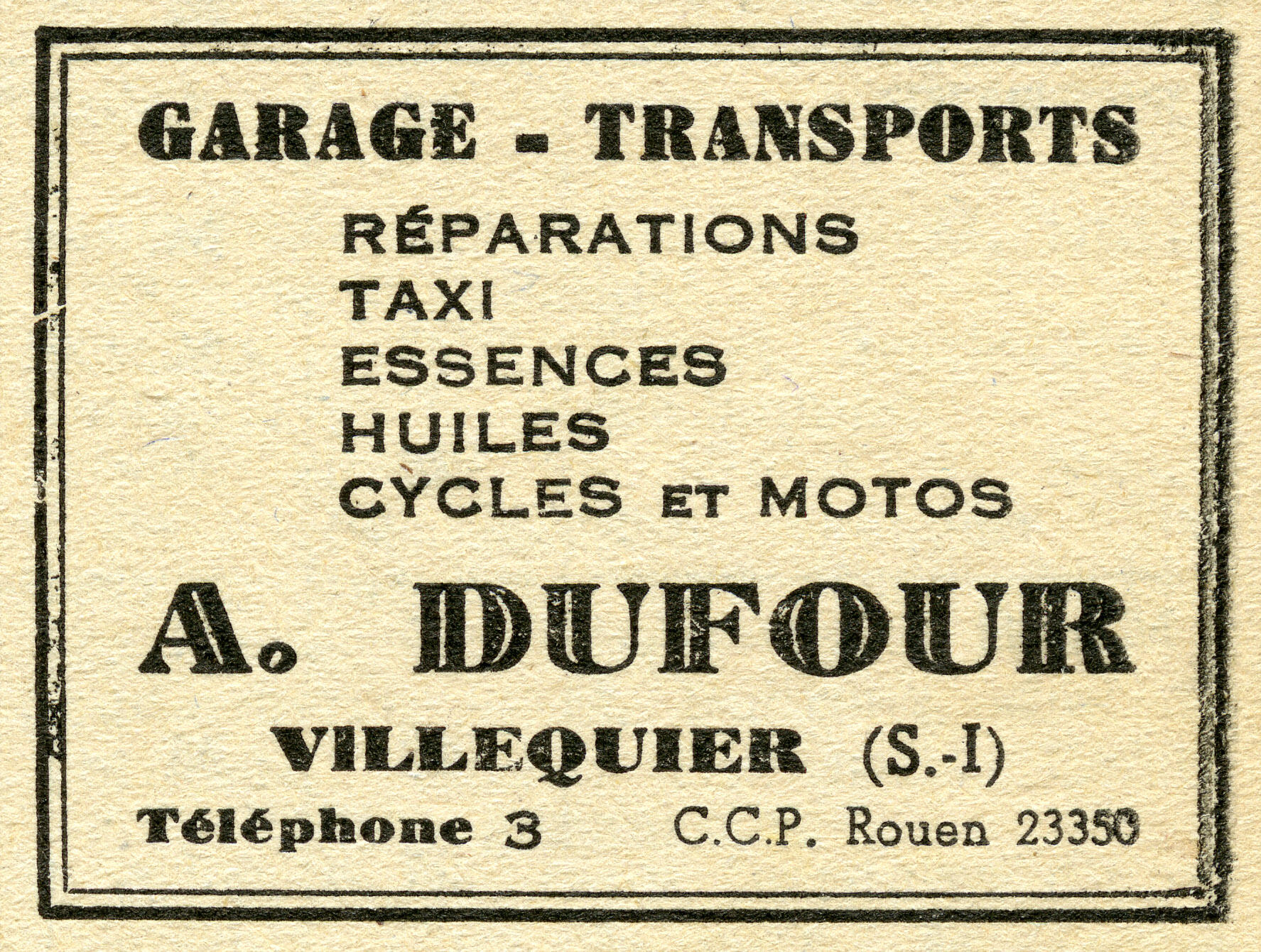 Garage A. Dufour.- Carton publicitaire, vers 1950 (Collection particulière).Immatriculation