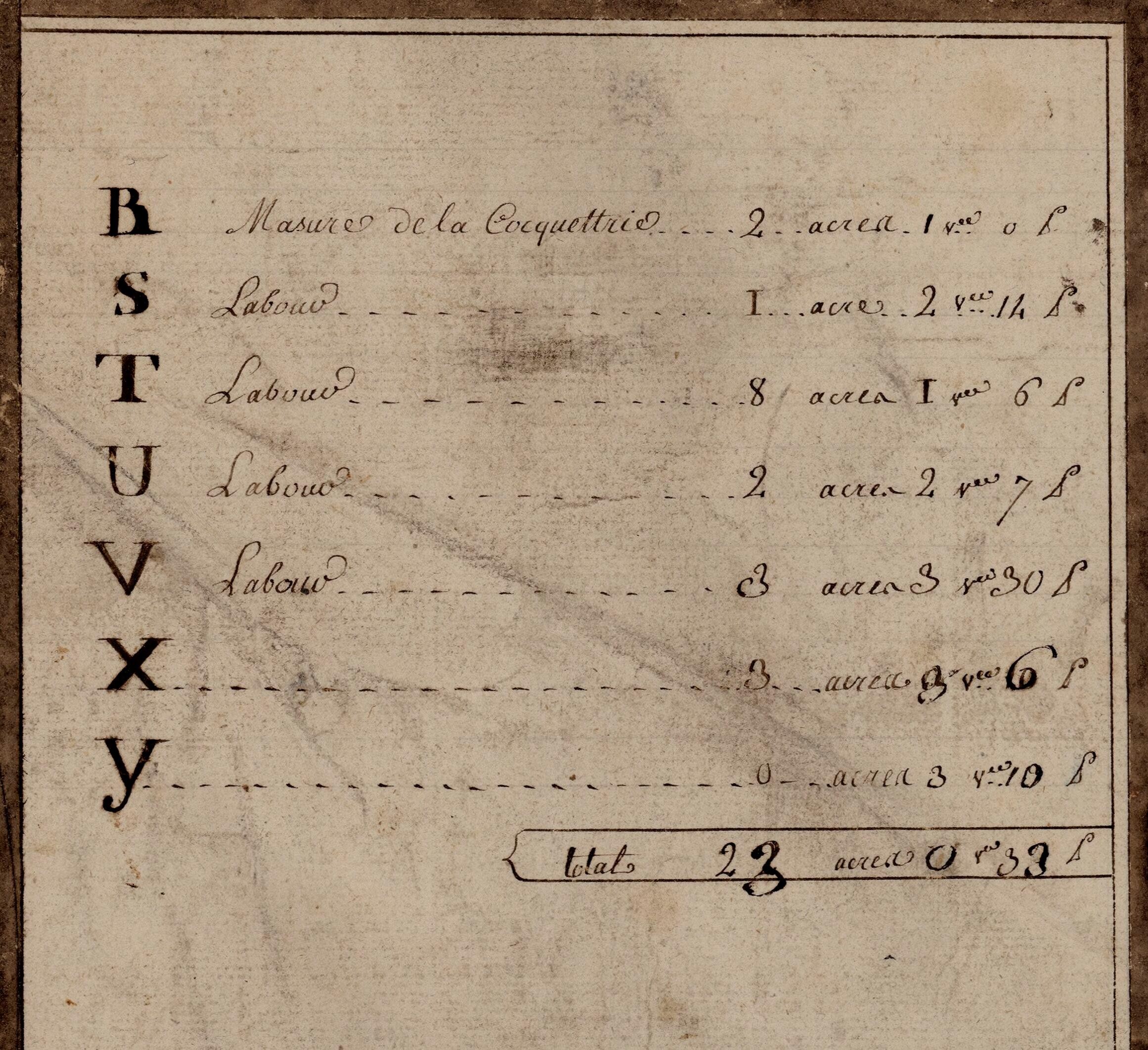 Légende de la carte des terroirs de Villequier et de Caudebec. Lettre R : masure de la Coquetterie.- Plan, 18e siècle (BNF, département des cartes et plans).Immatriculation