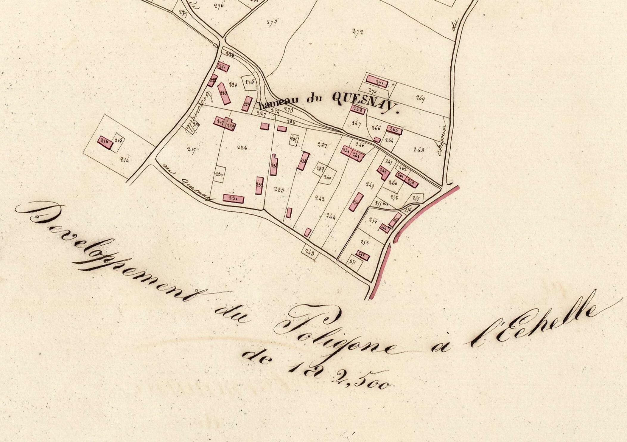 Hameau du Quesnay.- Extrait du cadastre napoléonien de Villequier, section C de Bébec, 1818 (AD Seine-Maritime, 3PL4_4_4).Immatriculation