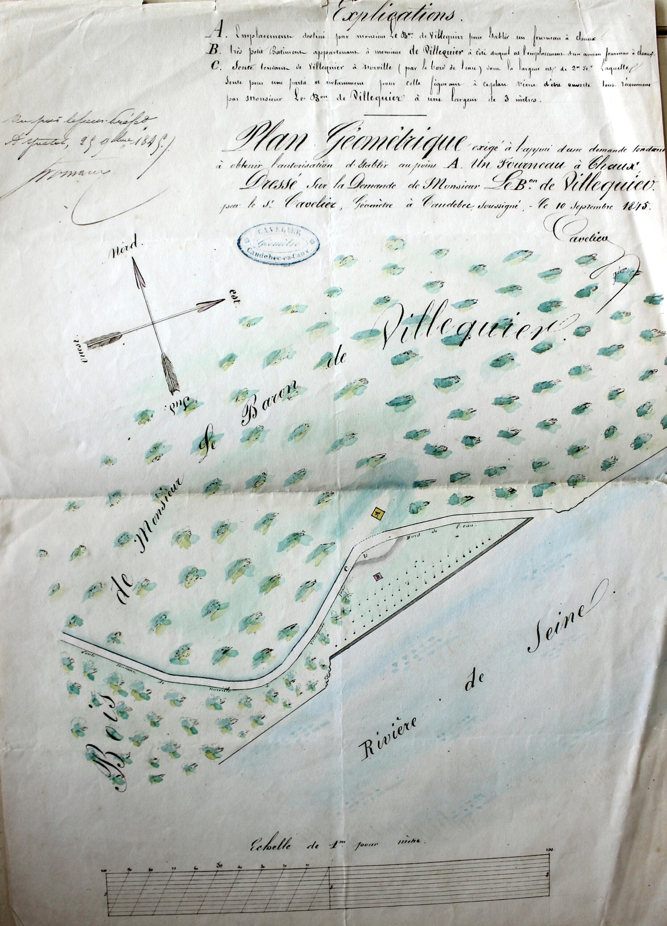Plan géométrique exigé à l'appui d'une demande tendant à obtenir l'autorisation d'établir un fourneau à chaux.- Plan aquarellé dressé sur la demande de Monsieur le Baron de Villequier par le sieur Cavelier, géomètre à Caudebec, 10 septembre 1845 (AD Seine Maritime, 5M 859).Immatriculation