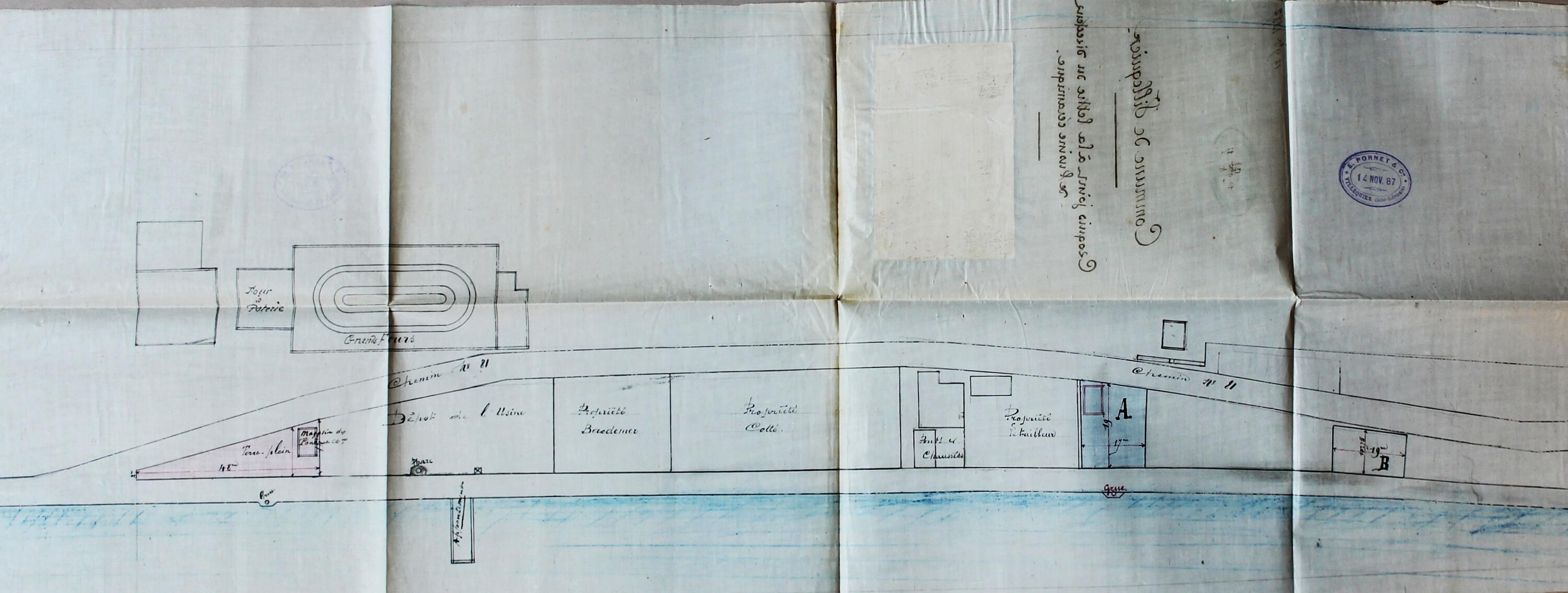 Alignement de parcelles bordant la Seine.- Plan assorti à l'autorisation préfectorale donnée au sieur Pellerin, administrateur de la société des argiles de Villequier, 10 décembre 1879 (AD Seine Maritime, 3S 114).Immatriculation