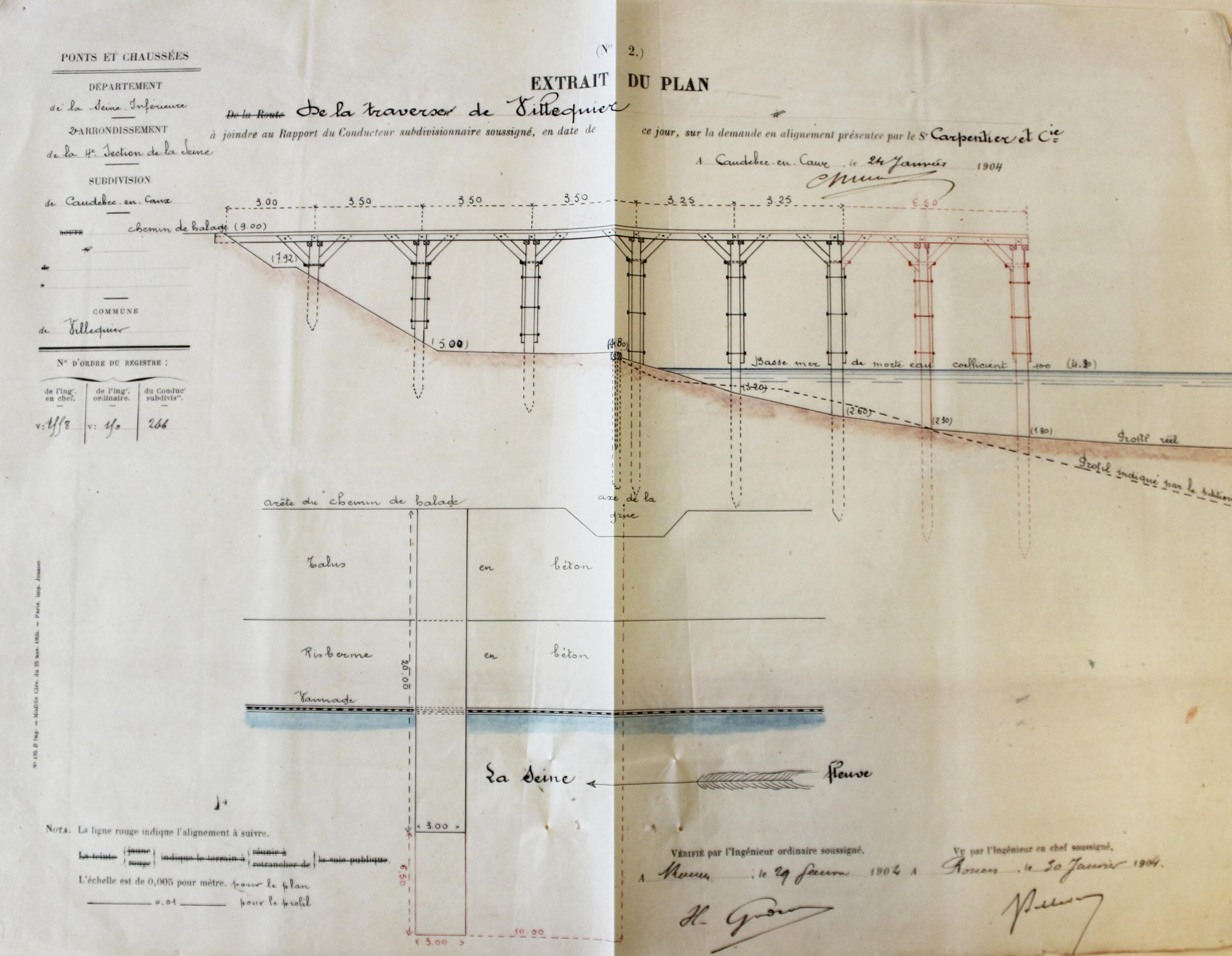 Extrait du plan de la traverse de Villequier.- Plan dressé par l'ingénieur des ponts-et-chaussées pour M. Carpentier et Cie, Caudebec-en-Caux, 24 janvier 1904 (AD Seine Maritime).Immatriculation