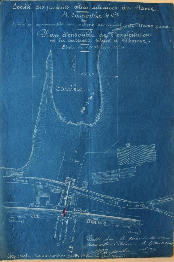 Plan d'ensemble de l'exploitation de la carrière située à Villequier.- Plan bleu, dressé par H. Carpentier, gérant de la société des produits silico-calcaires du Havre, Graville Ste Honorine, 17 avril 1903 (AD Seine Maritime).Immatriculation