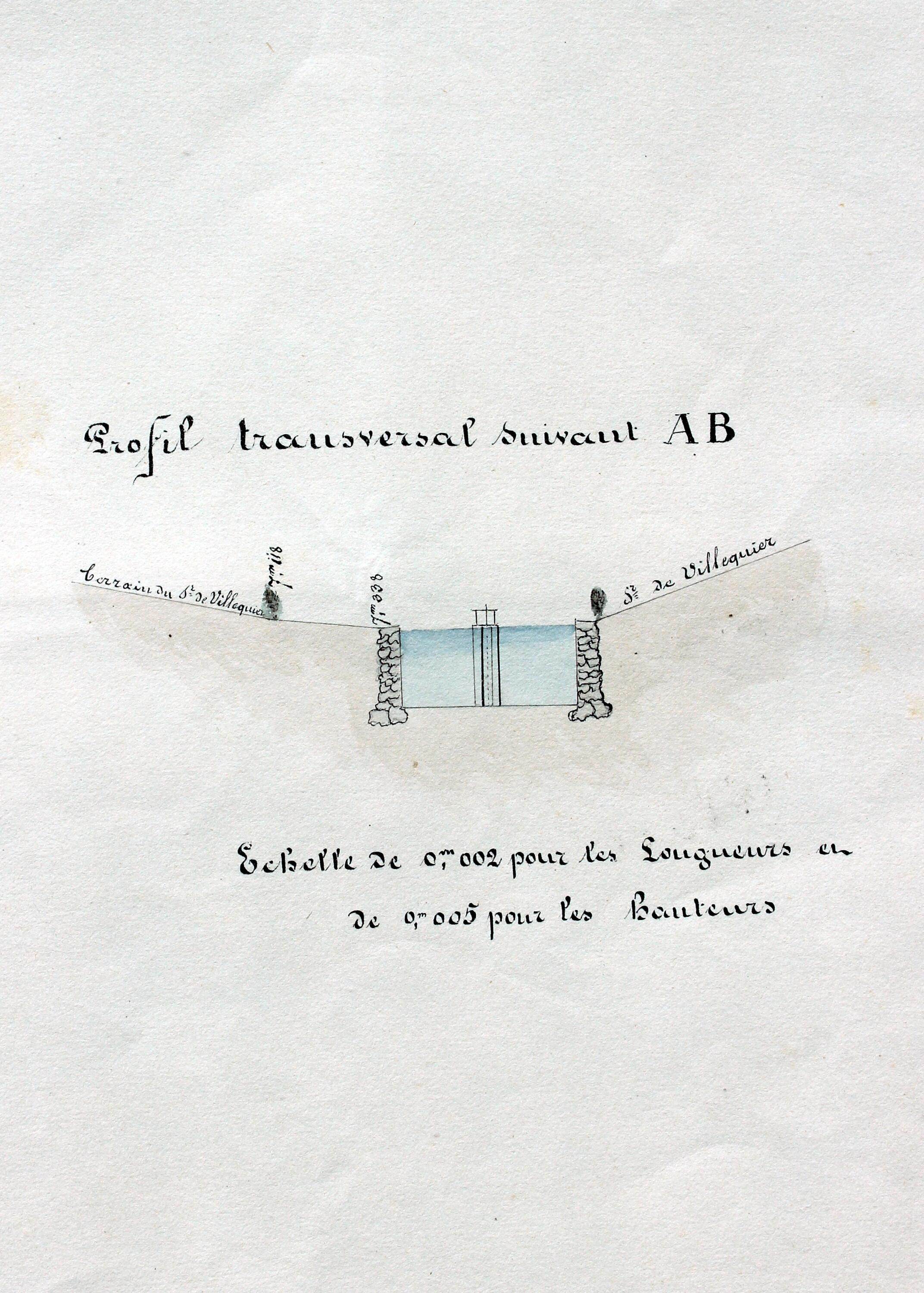Ruisseau de la Fontaine du Nord, profil transversal.- Détail du plan dressé par l'ingénieur ordinaire de l'arrondissement d'Yvetot, 23 juillet 1849 (AD Seine-Maritime, 7S 29).Immatriculation
