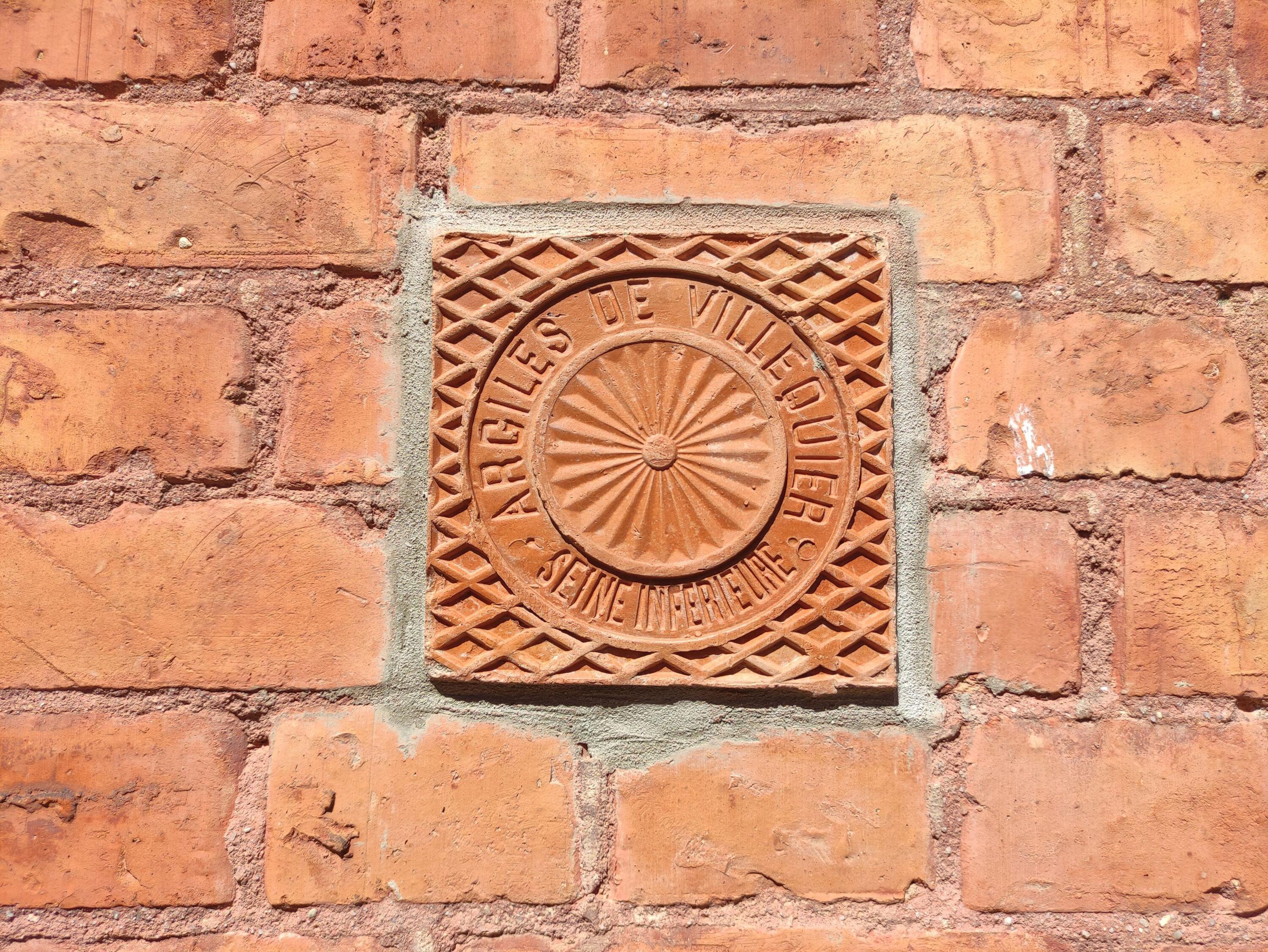 Carreau de pavement inséré sur la façade d'une maison. Face arrière portant l'inscription : Argiles de Villequier.- Maison en brique de Villequier, rue Ernest Binet.Immatriculation