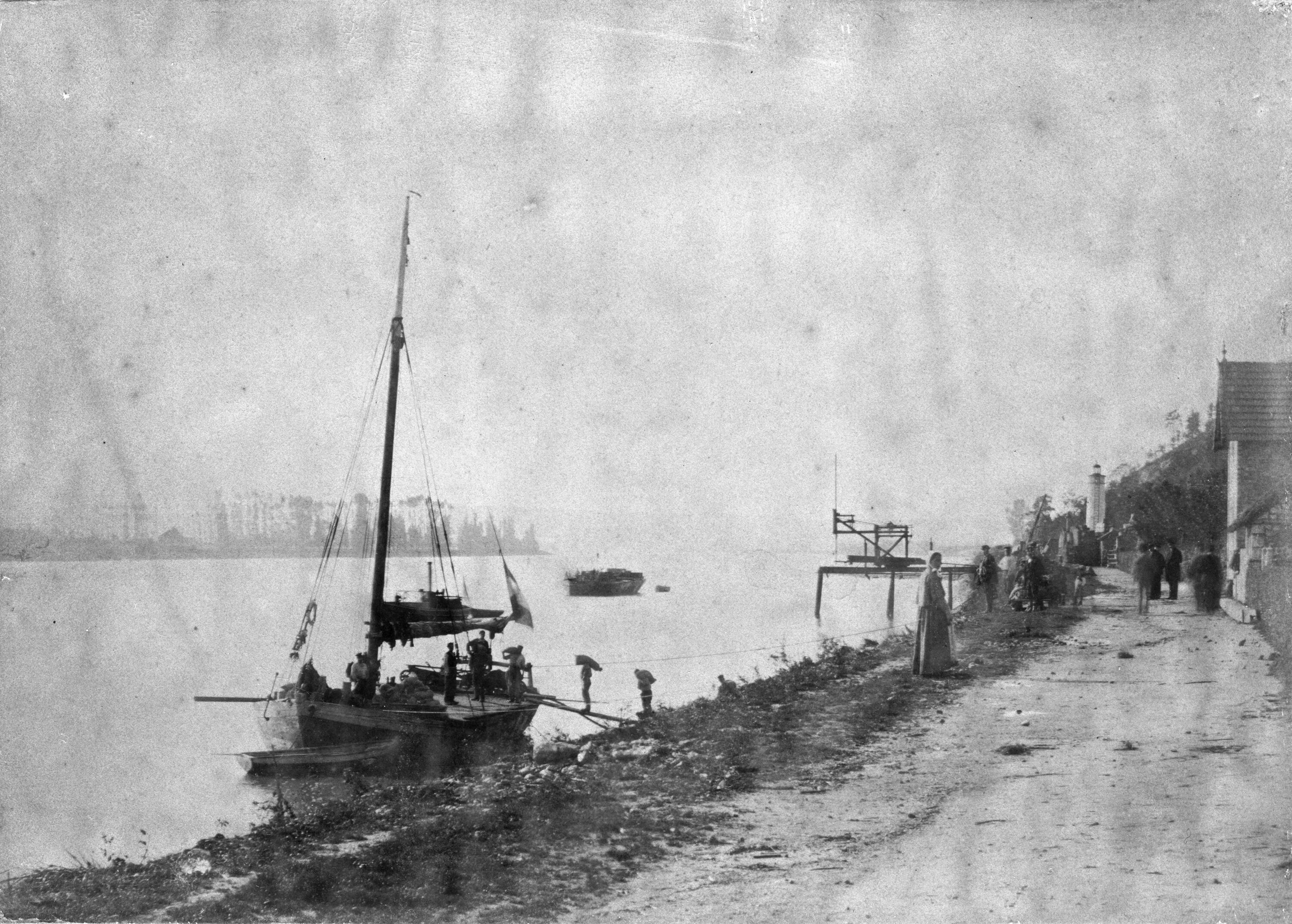 Chargement d'une gribane le long des berges de Seine. Le phare de Villequier est visible à l'arrière-plan.- Photographie argentique en noir et blanc (Collection du musée Victor Hugo).Immatriculation