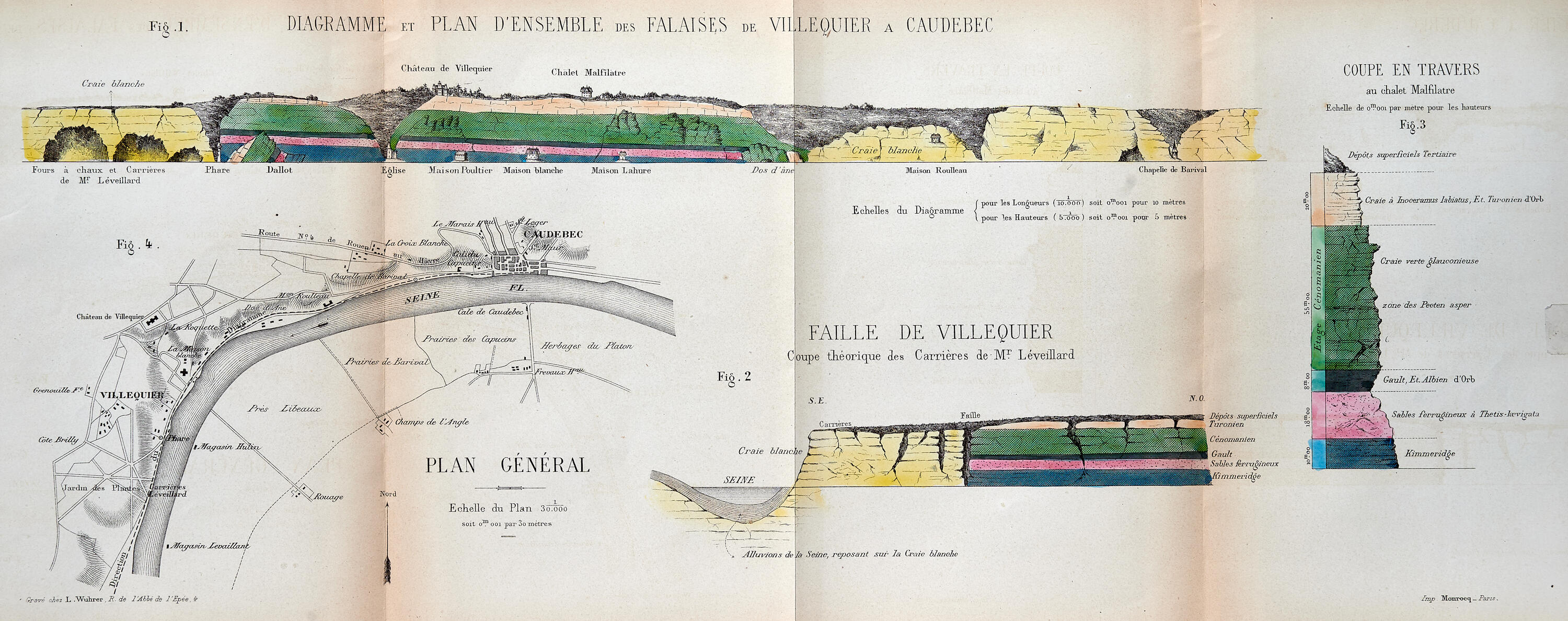 Diagramme et plan d'ensemble des falaises de Villequier à Caudebec et Coupe de la faille de Villequier.- Plan annexé à l'étude géologique de Villequier publiée dans le bulletin de la Société géologique de Normandie, T. VIII, 1881.Immatriculation