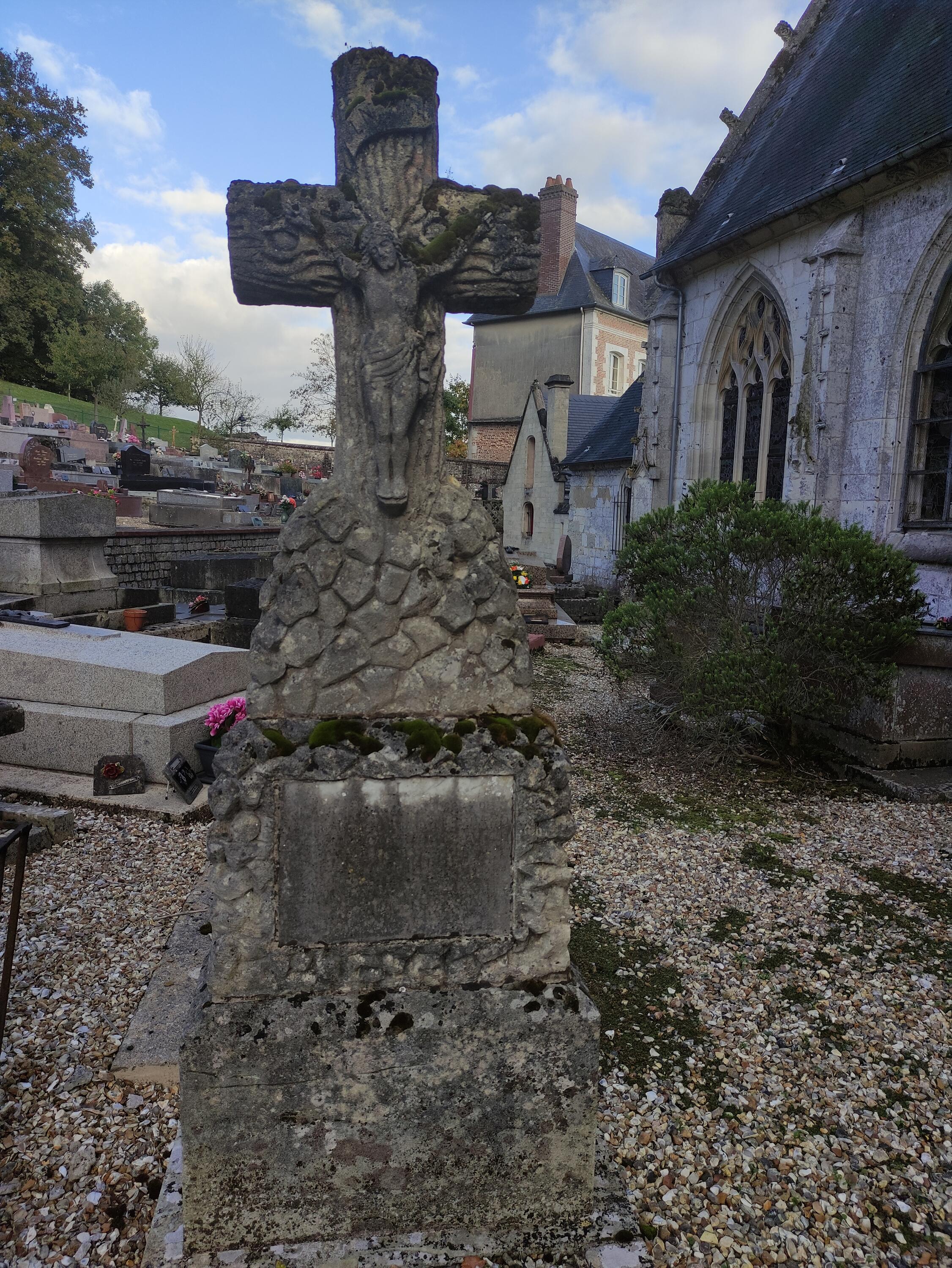 Détail d'une tombe avec Christ en croix en rusticage.Immatriculation