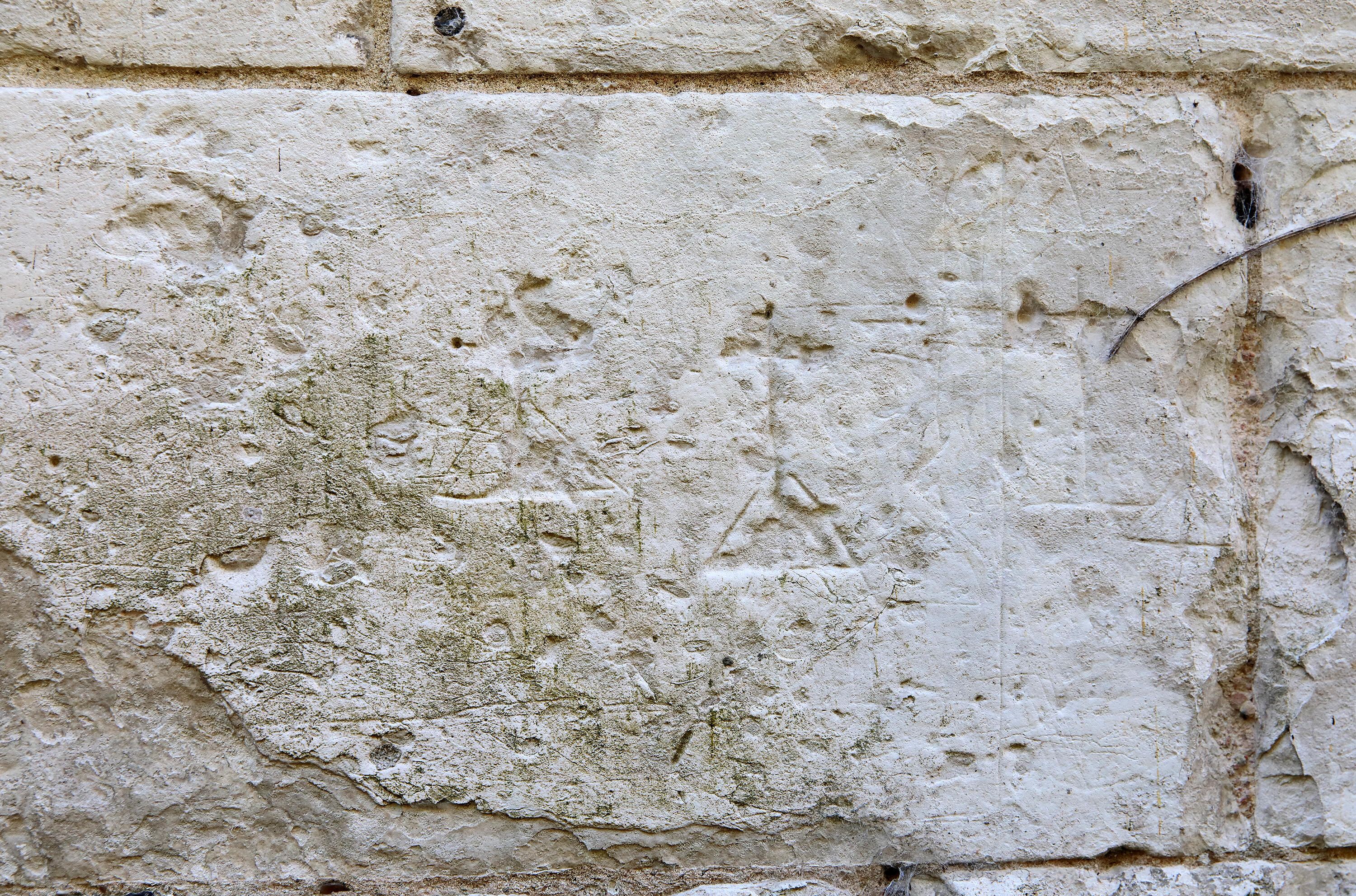 Manoir, extérieur, façade nord, graffiti marin, détail.Immatriculation