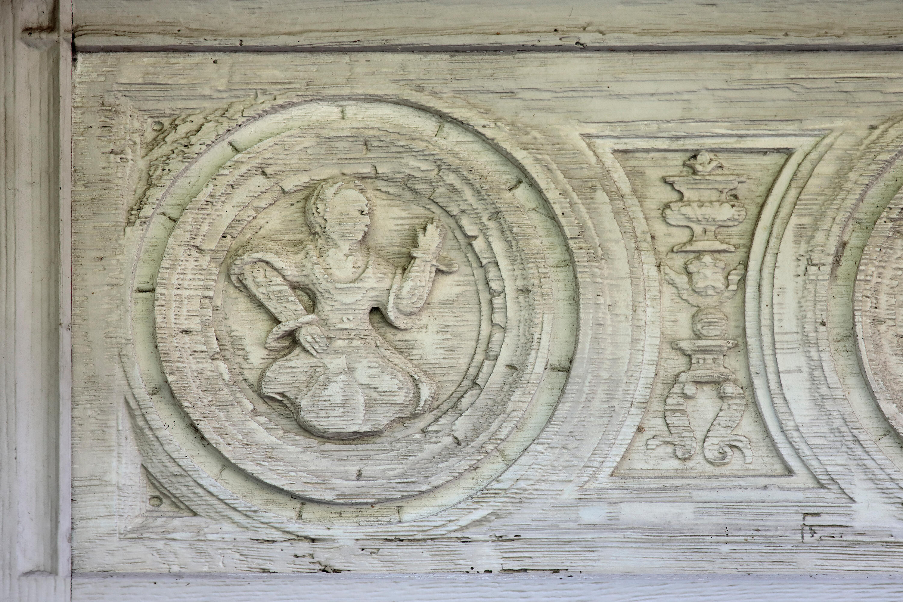 Manoir, façade nord, porte ouest, détail du médaillon dextre : buste féminin et motif ornemental.Immatriculation
