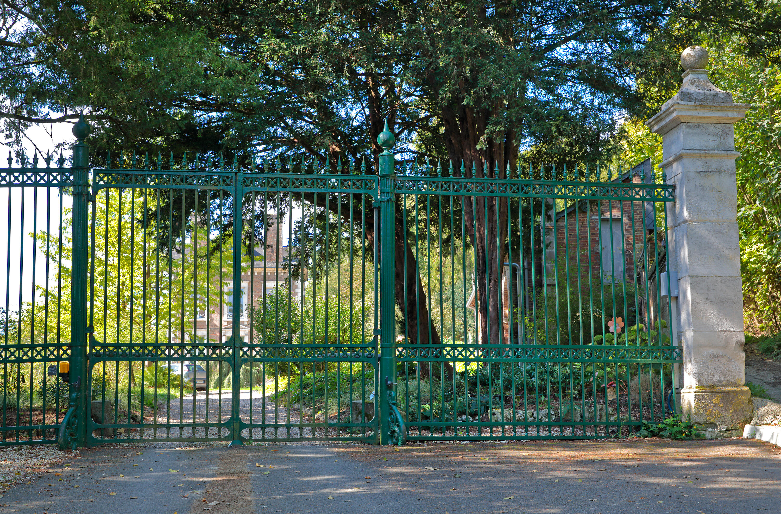 Portail, détail de la grille et de la pile nord.Immatriculation