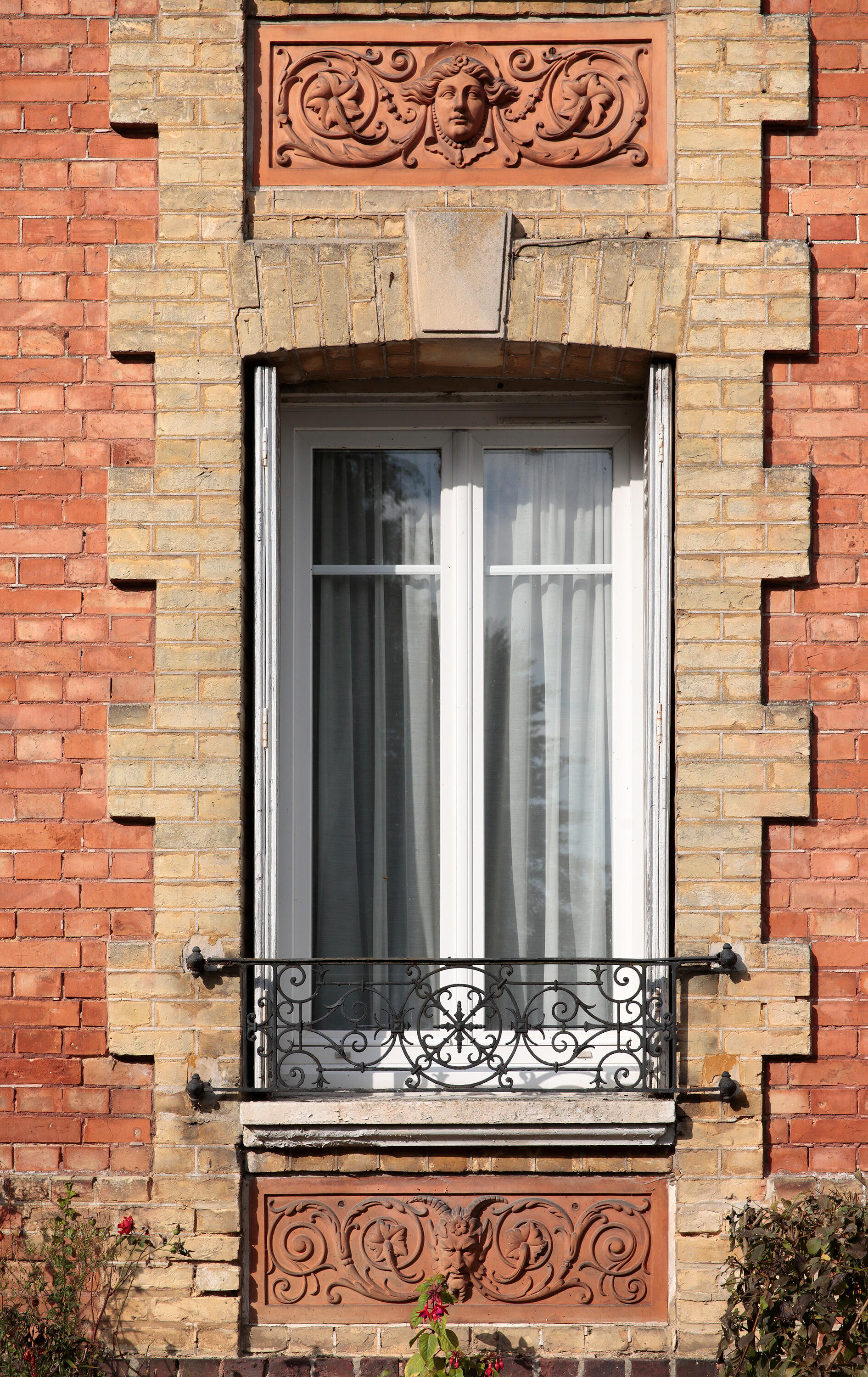 Façade sur cour, détail d'une baie et d'allèges ornées de motifs en terre cuite.Immatriculation