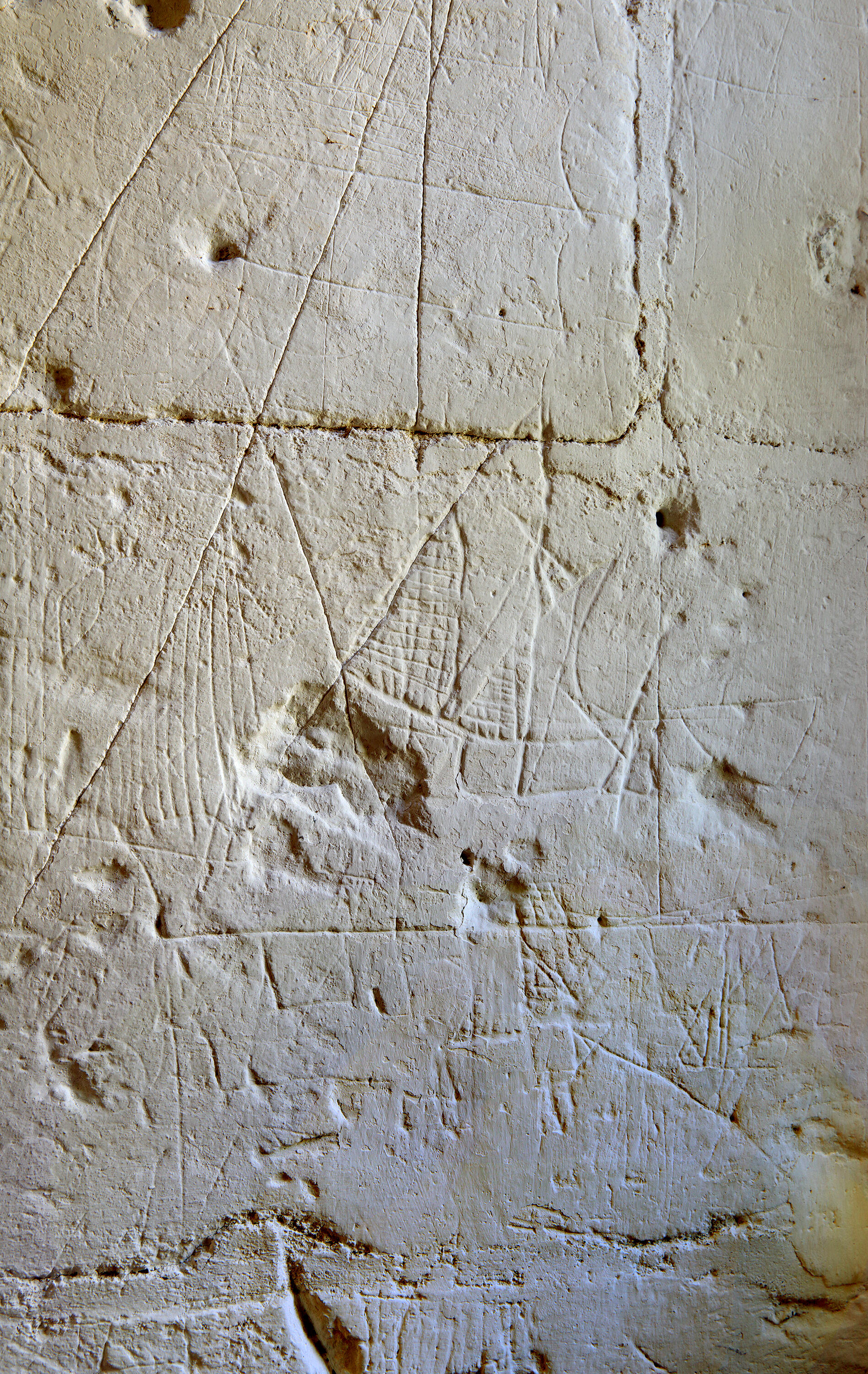 Manoir, intérieur, graffito marin, détail.Immatriculation
