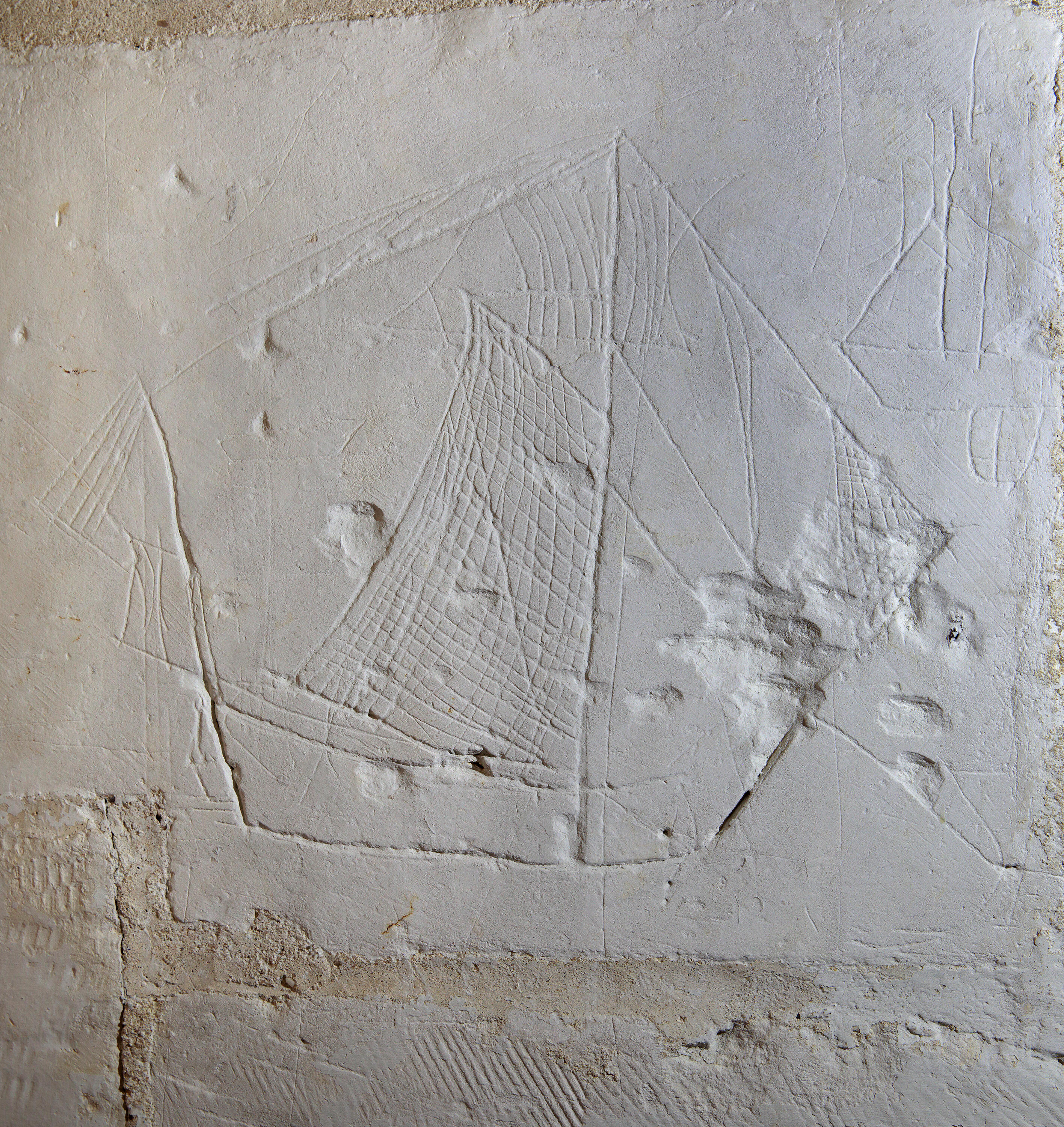 Manoir, intérieur, graffito marin, détail.Immatriculation