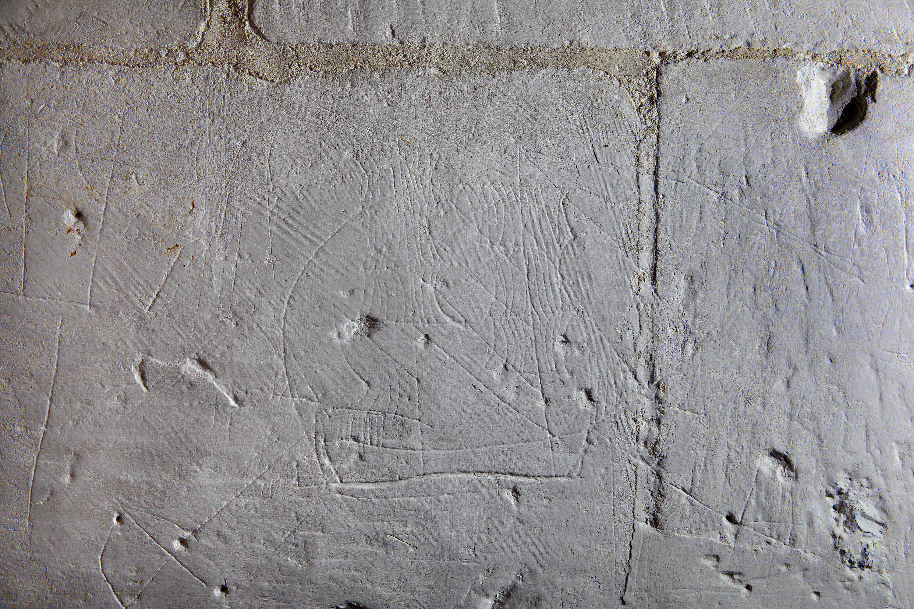 Manoir, intérieur, graffito marin, détail.Immatriculation