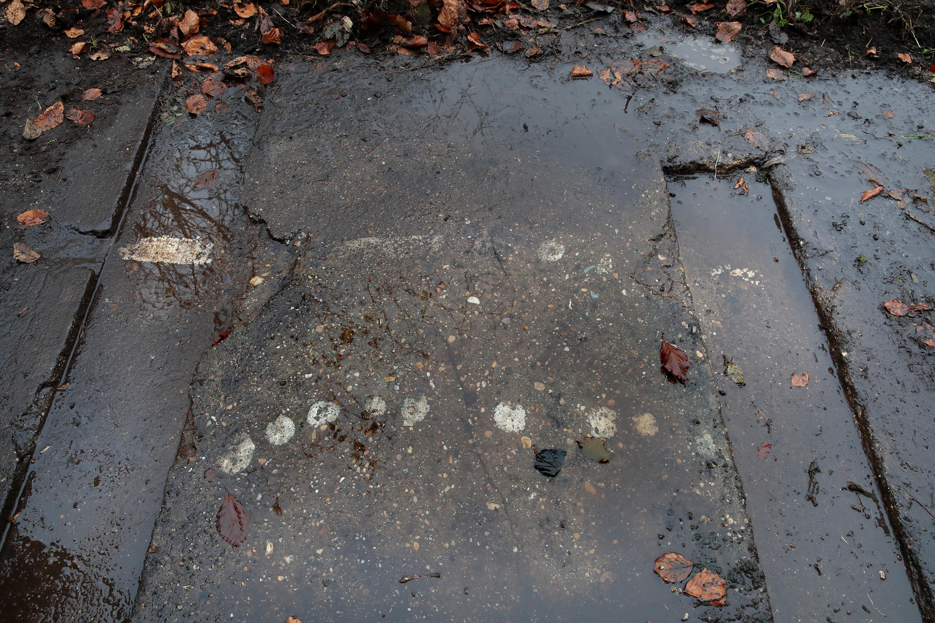 Dalle amagnétique, rails en creux destinés à guider le chariot et marquages à la peinture blanche, détail.Immatriculation