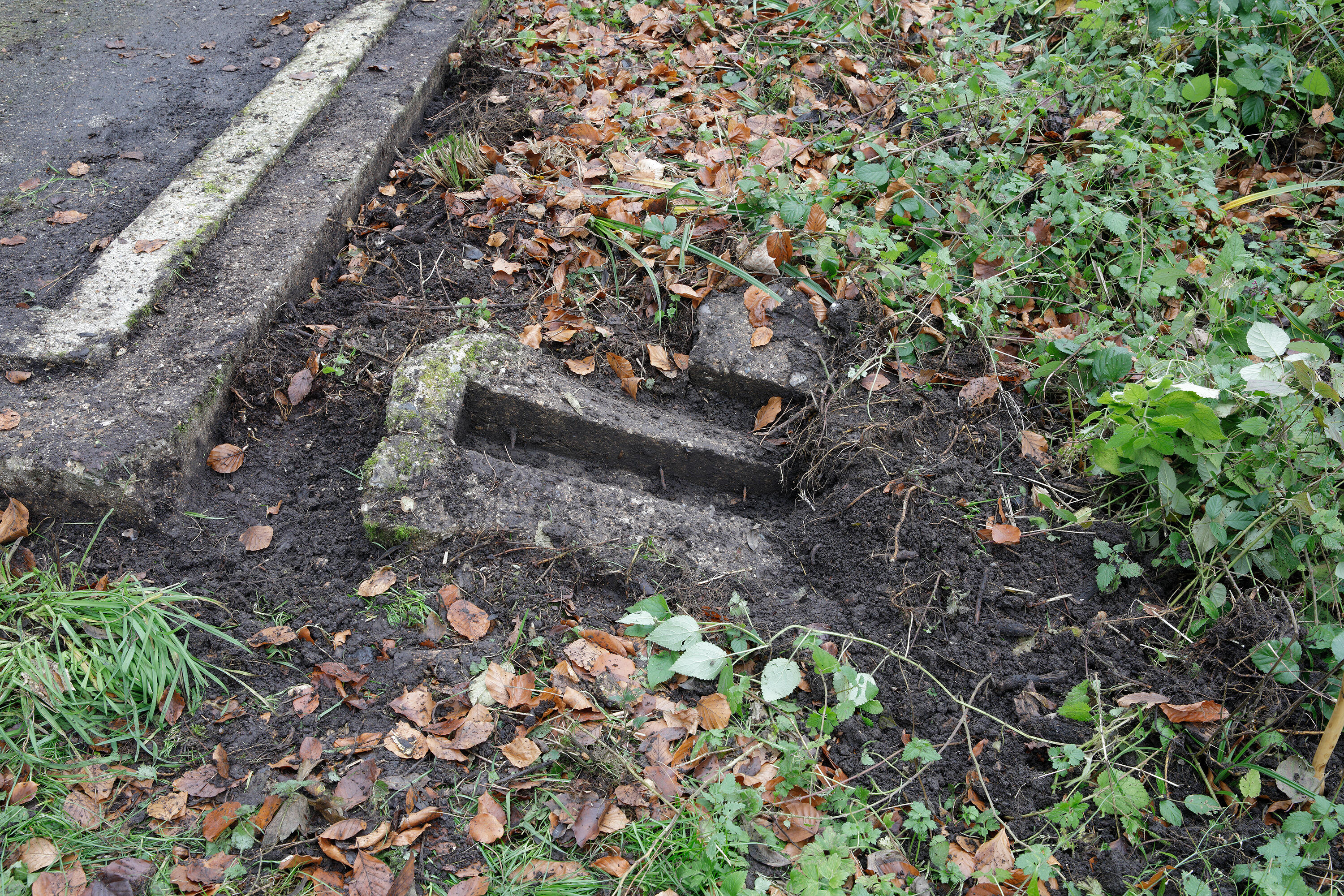 Dalle amagnétique, vestige de la semelle permettant le coulissement d'un vantail de porte.Immatriculation