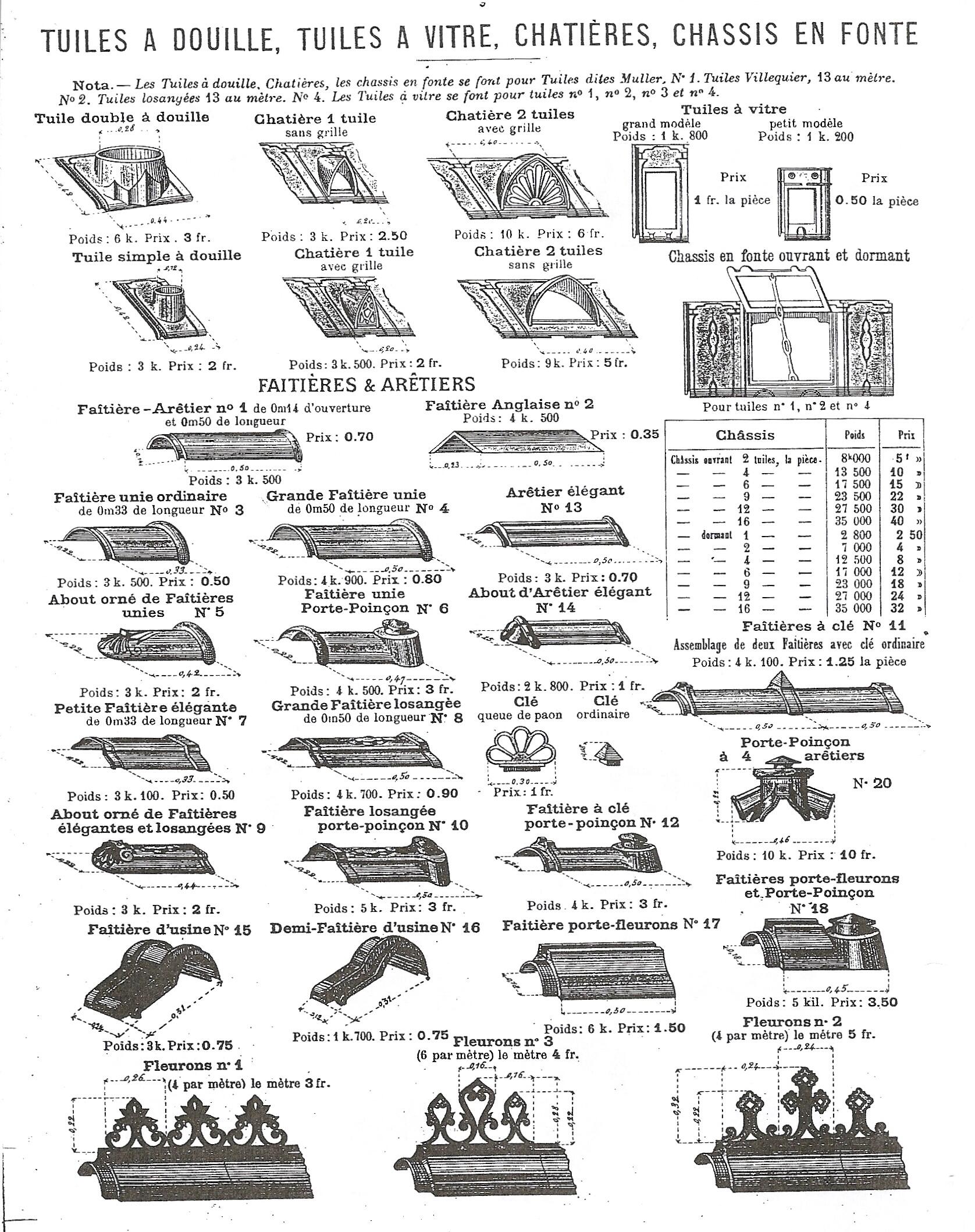 Page consacrée aux tuiles à douille, tuile à vitre, chatières, châssis en fonte, détail . Catalogue de la production des Etablissements Céramique de Villequier, 1890. (Collection particulière)Immatriculation