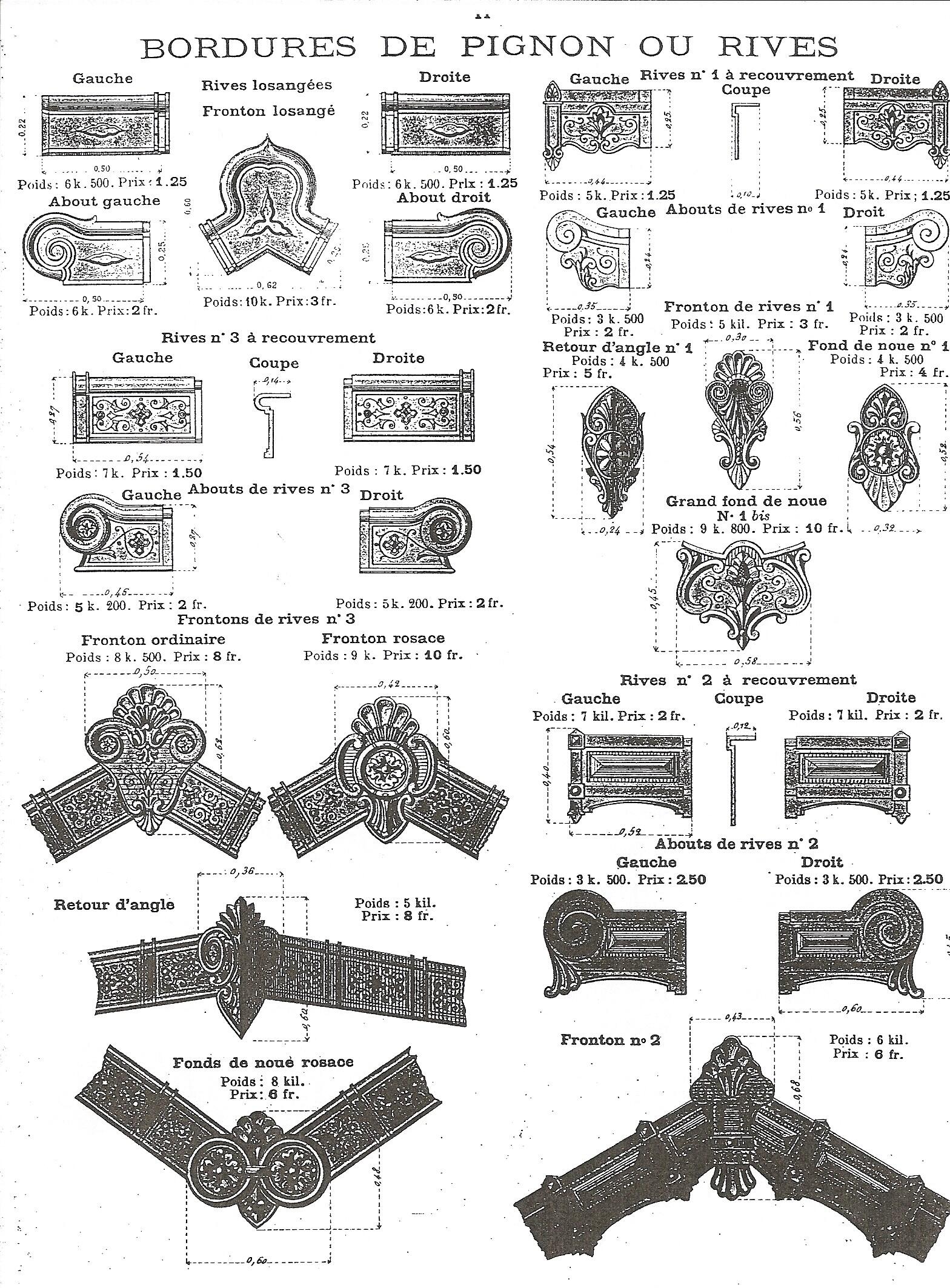 Page consacrée aux bordures de pignon ou rives, détail . Catalogue de la production des Etablissements Céramique de Villequier, 1890. (Collection particulière)Immatriculation