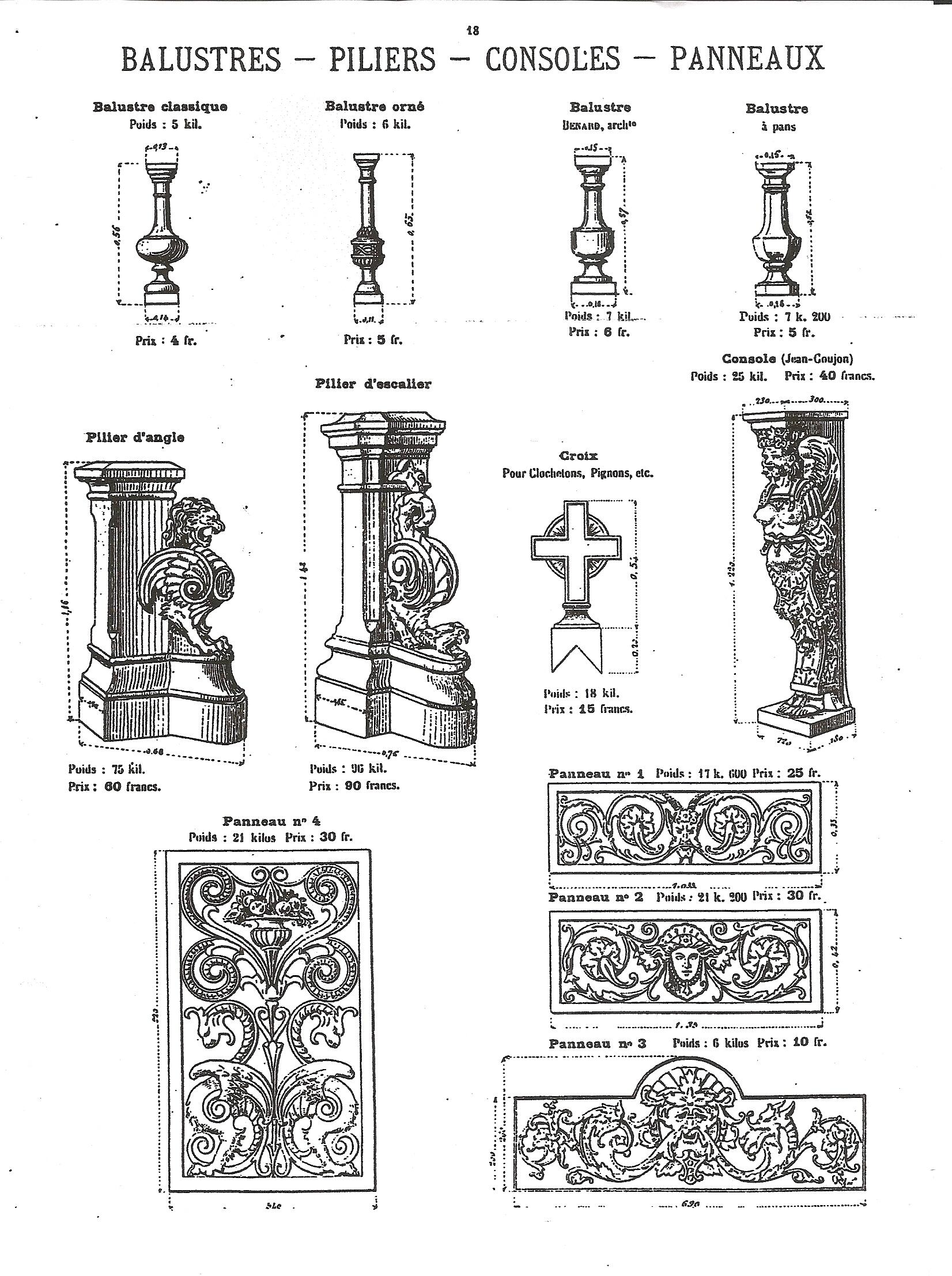 Page consacrée aux balustres, piliers, consoles, panneaux, détail . Catalogue de la production des Etablissements Céramique de Villequier, 1890. (Collection particulière).Immatriculation