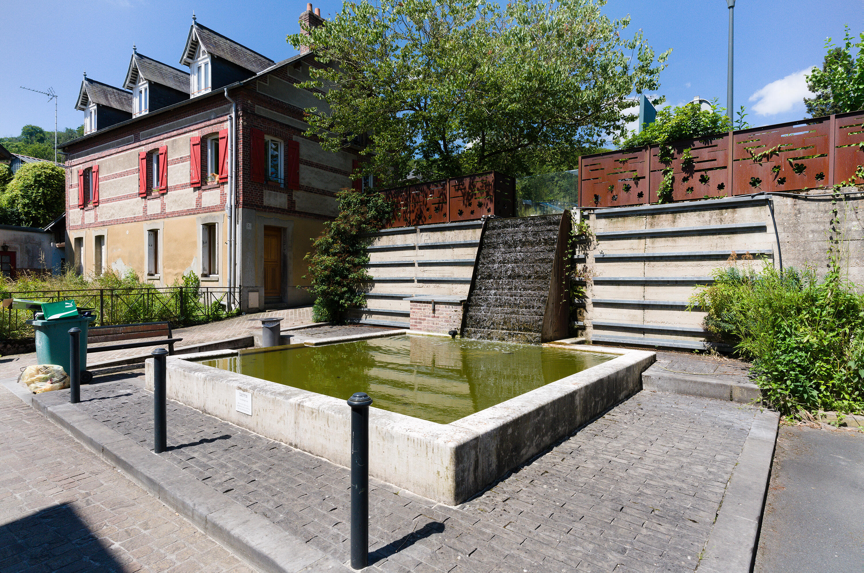 Vue en contrebas du parking du musée Victor Hugo avec ancienne boulangerie à l'arrière-plan.- Rue Ernest Binet.Immatriculation