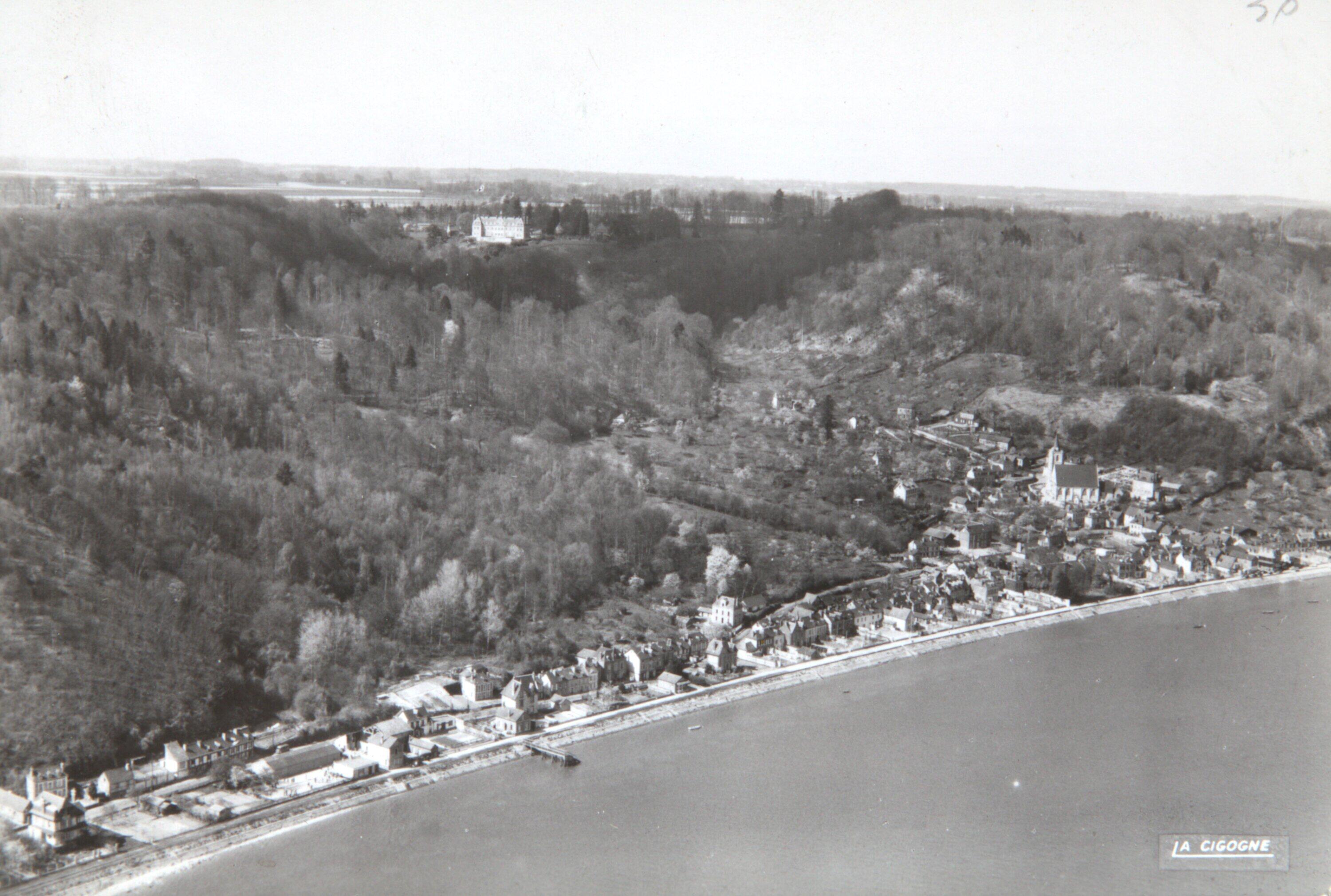 Vue aérienne de Villequier.- Carte postale 76.742.11, Vers 1950, photographie R. Henrard, éditions La Cigogne. (Collection Bardel).Immatriculation