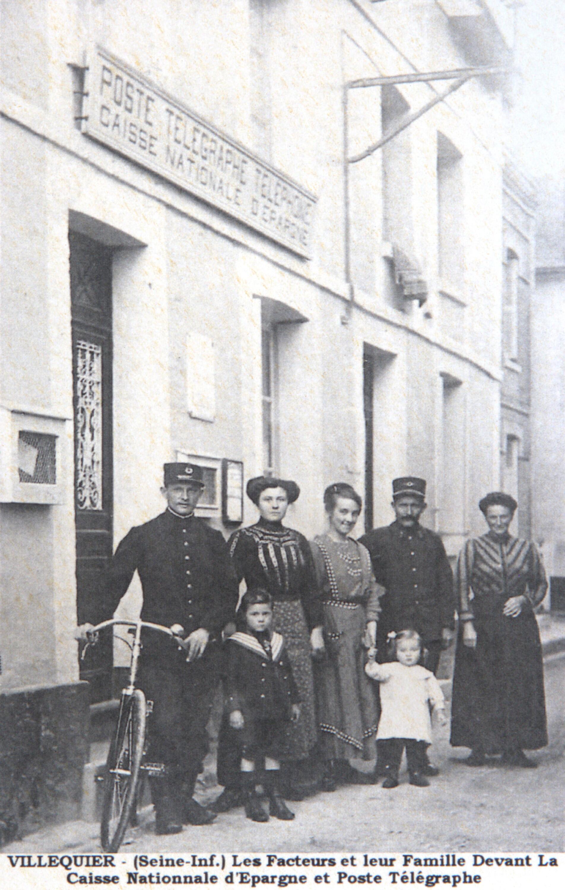 VILLEQUIER - (Seine-Inf.) Les facteurs et leur Famille Devant La Caisse Nationale d'Epargne et Poste Télégraphe.- Carte postale, s.d. [vers 1900-1910], réédition Image de France, reproduction cauchoise. (Collection Bardel).Immatriculation