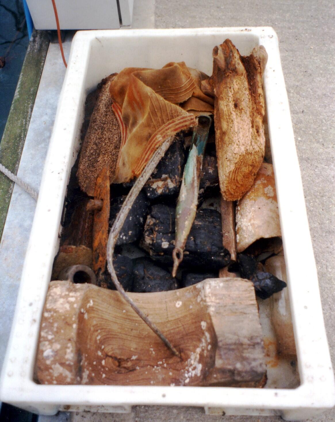 Eléments remontés lors de la plongée sur l'épave, dont un loch. (Collection Lacaille).Immatriculation