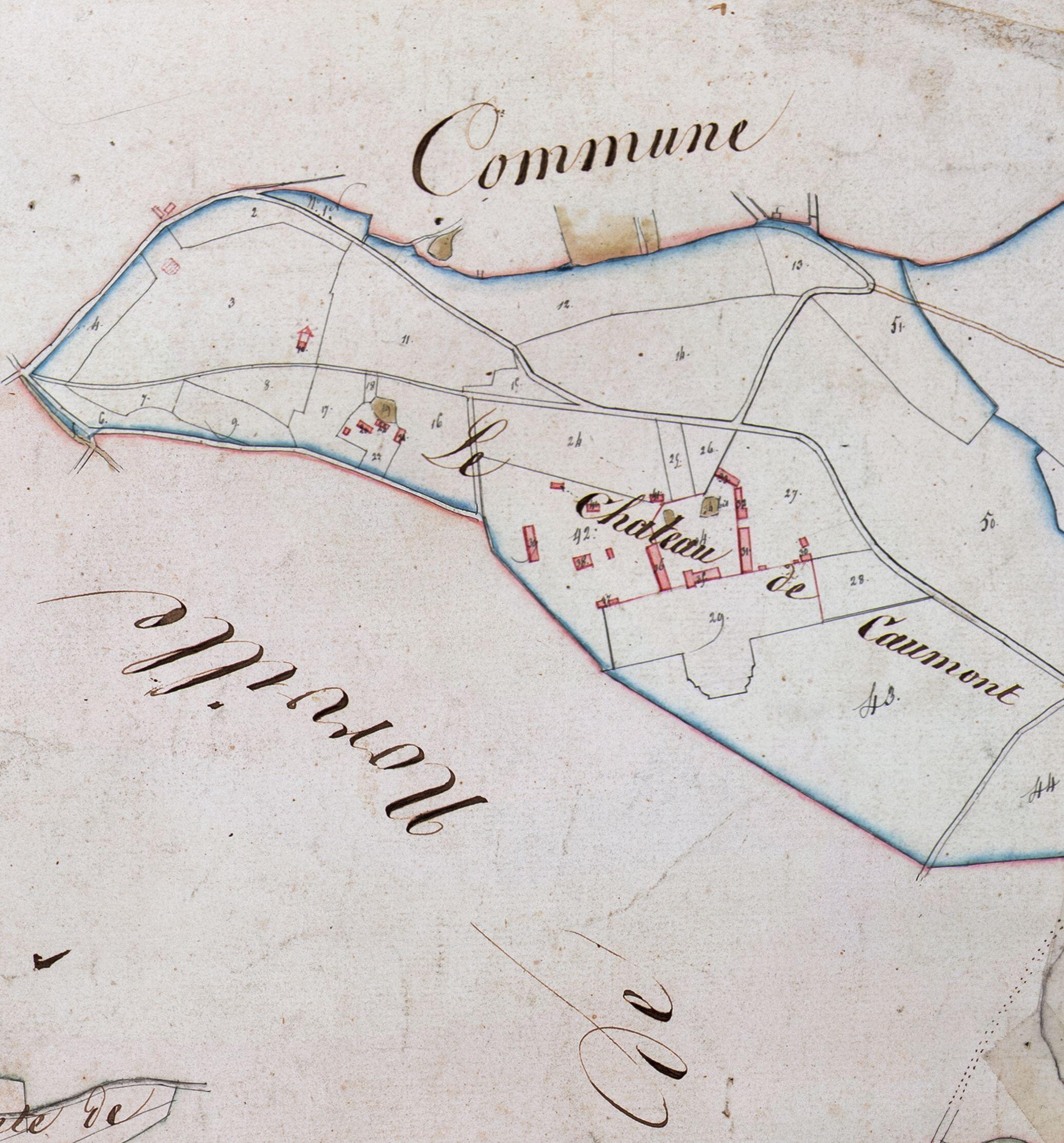 Le château de Caumont.- Extrait du plan géométrique de la commune de Villequier.- Plan parcellaire levé par Leclerc, géomètre, 1817 (Archives communales de Rives-en-Seine).Immatriculation