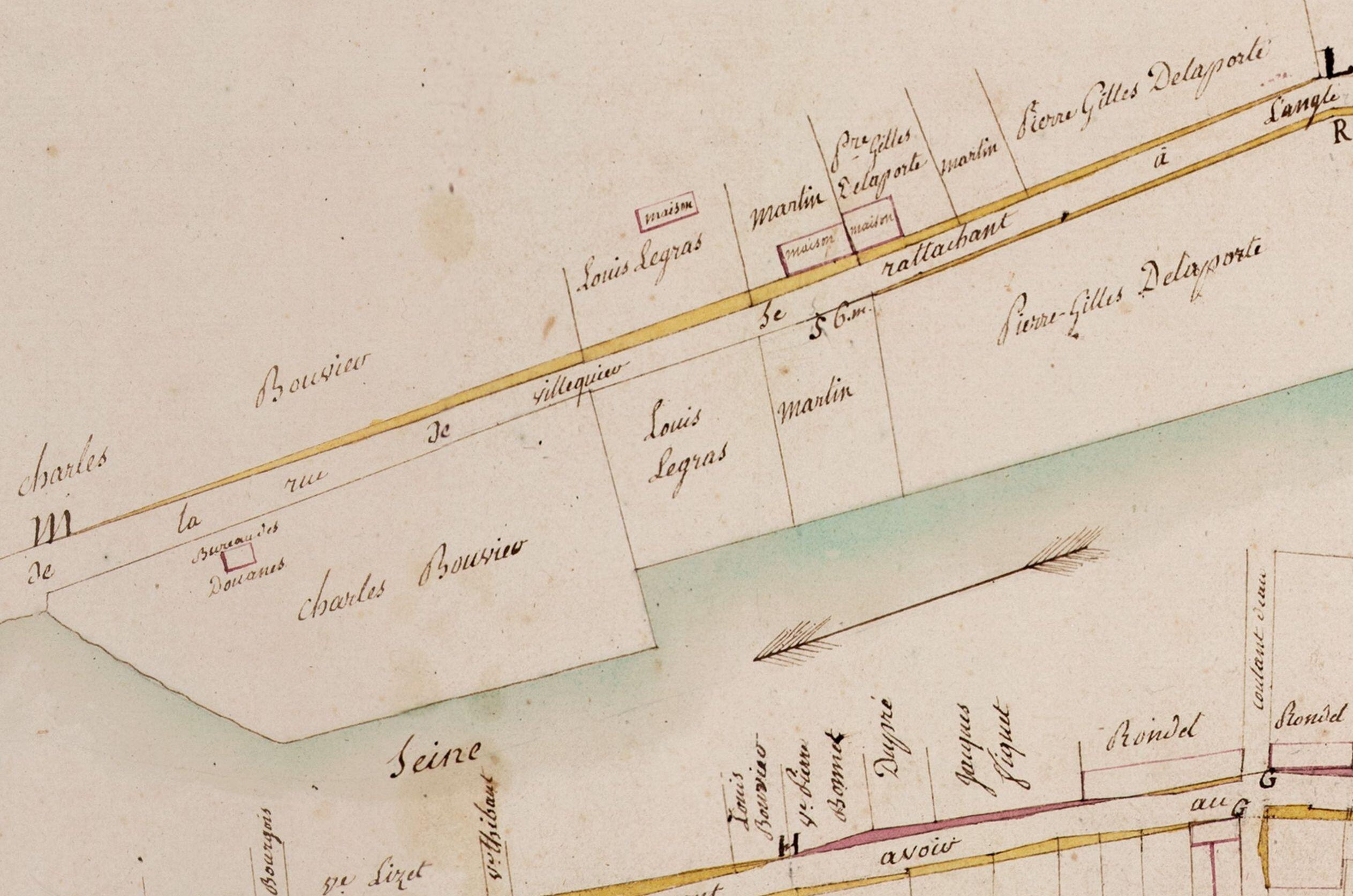 Propriétés du bord de Seine.- Extrait du plan géométrique du bourg de Villequier destiné au redressement des rues.- Plan levé par M. Daragon, géomètre du cadastre et arpenteur public, 11 mars 1820 (Archives communales de Rives-en-Seine).Immatriculation