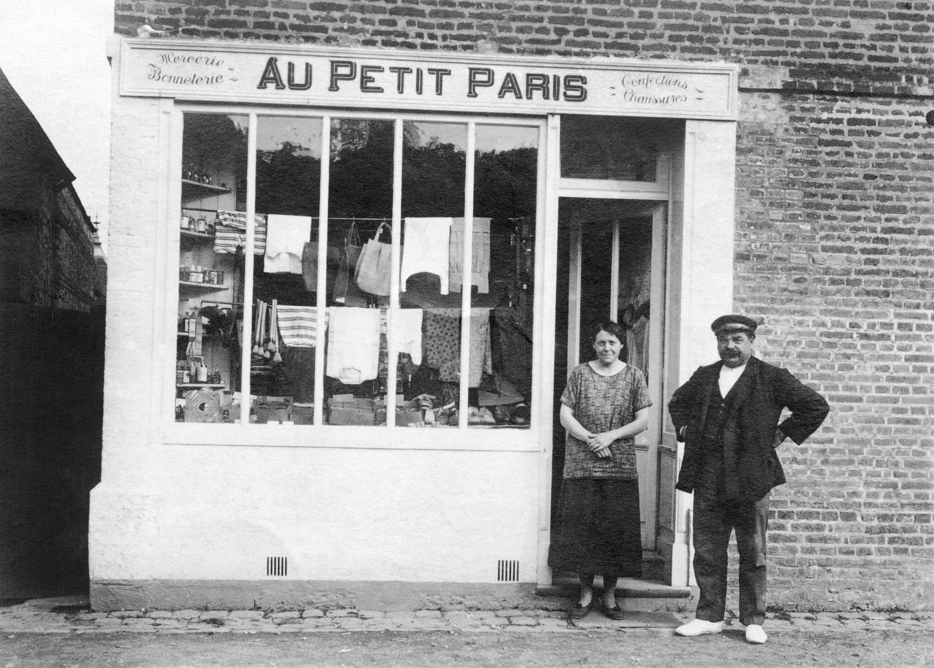 Devanture de boutique : AU PETIT PARIS.- Photographie noir et blanc, vers 1940 (Collection particulière).Immatriculation