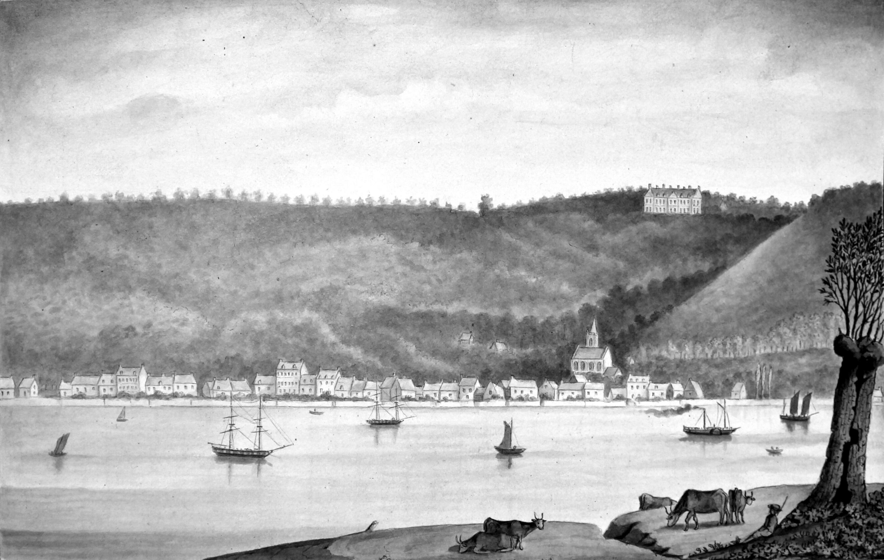 Vue de Villequier, proche Caudebec.- Monuments civils et religieux, et maisons particulières de Caudebec et ses environs, décrits et dessinés par Le Sage de Caudebec, vol.1, 1827 (BM de Rouen / Ms Y 8).Immatriculation