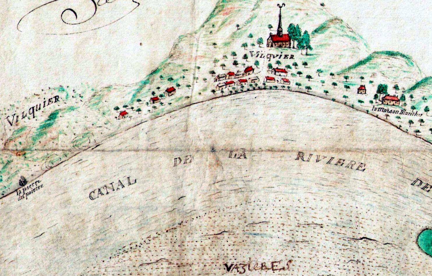 Plan et figure d'une isle scize entre la parroisse de Vilquier et les terres de Vatteville : détail de la section entre la Pierre au poirier et la Maison blanche.- Plan manuscrit couleur par Raphaël Auger, grand arpenteur de Normandie, et Pierre Legendre, arpenteur royal, 1681 (AD Seine-Maritime, 12 Fi 641/2).Immatriculation