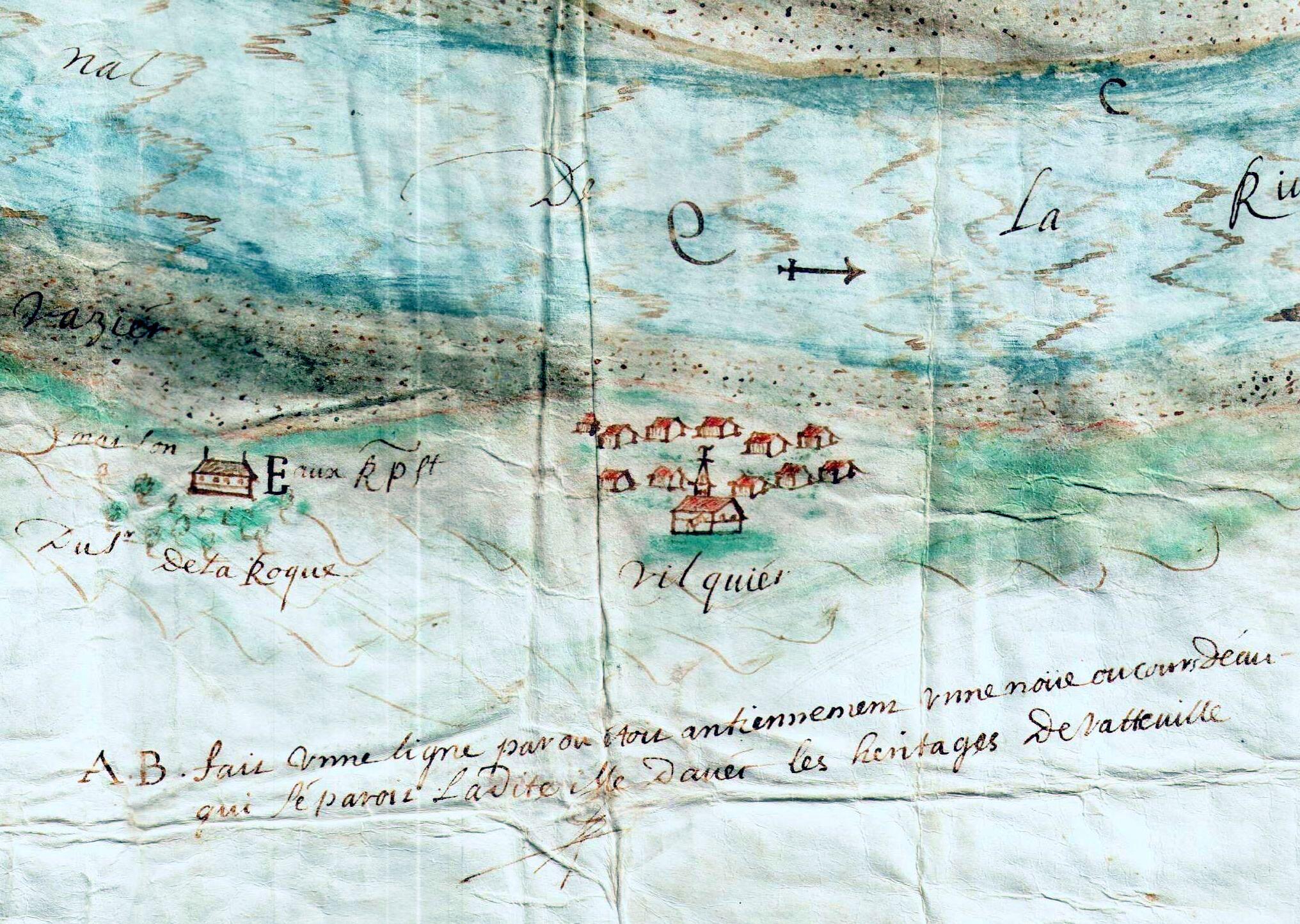 Plan et description de l'ile de Bresillac située entre Vatteville et Caudebec : détail du village de Villequier.- Plan manuscrit couleur par Delavigne, 1656 (AD Seine-Maritime, 12 Fi 641/1).Immatriculation