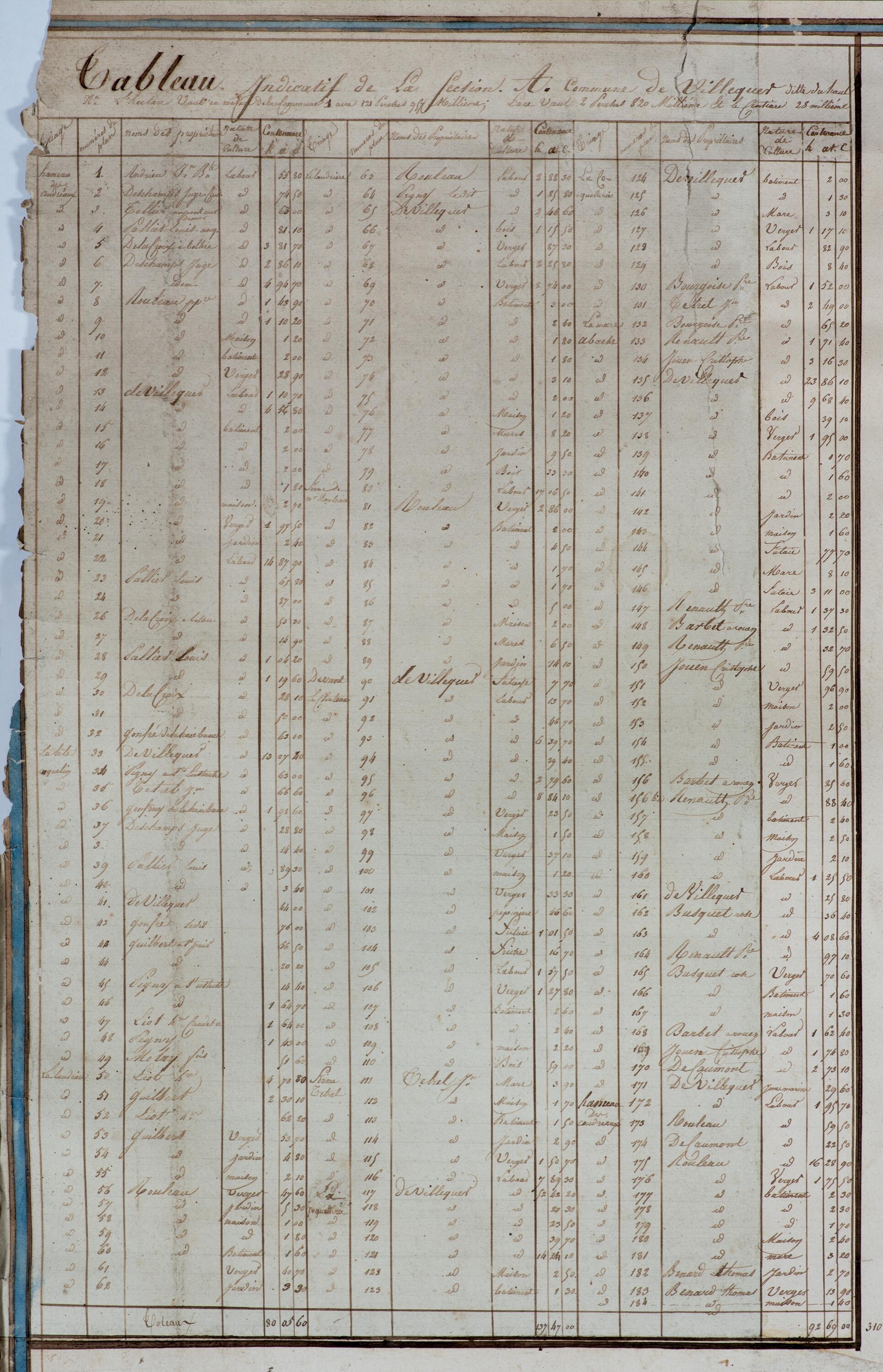 Plan géométrique de la commune de Villequier, détail de la table attributive des parcelles de la section A.- Plan parcellaire levé par Leclerc, géomètre, 1817 (Archives communales de Rives-en-Seine).Immatriculation