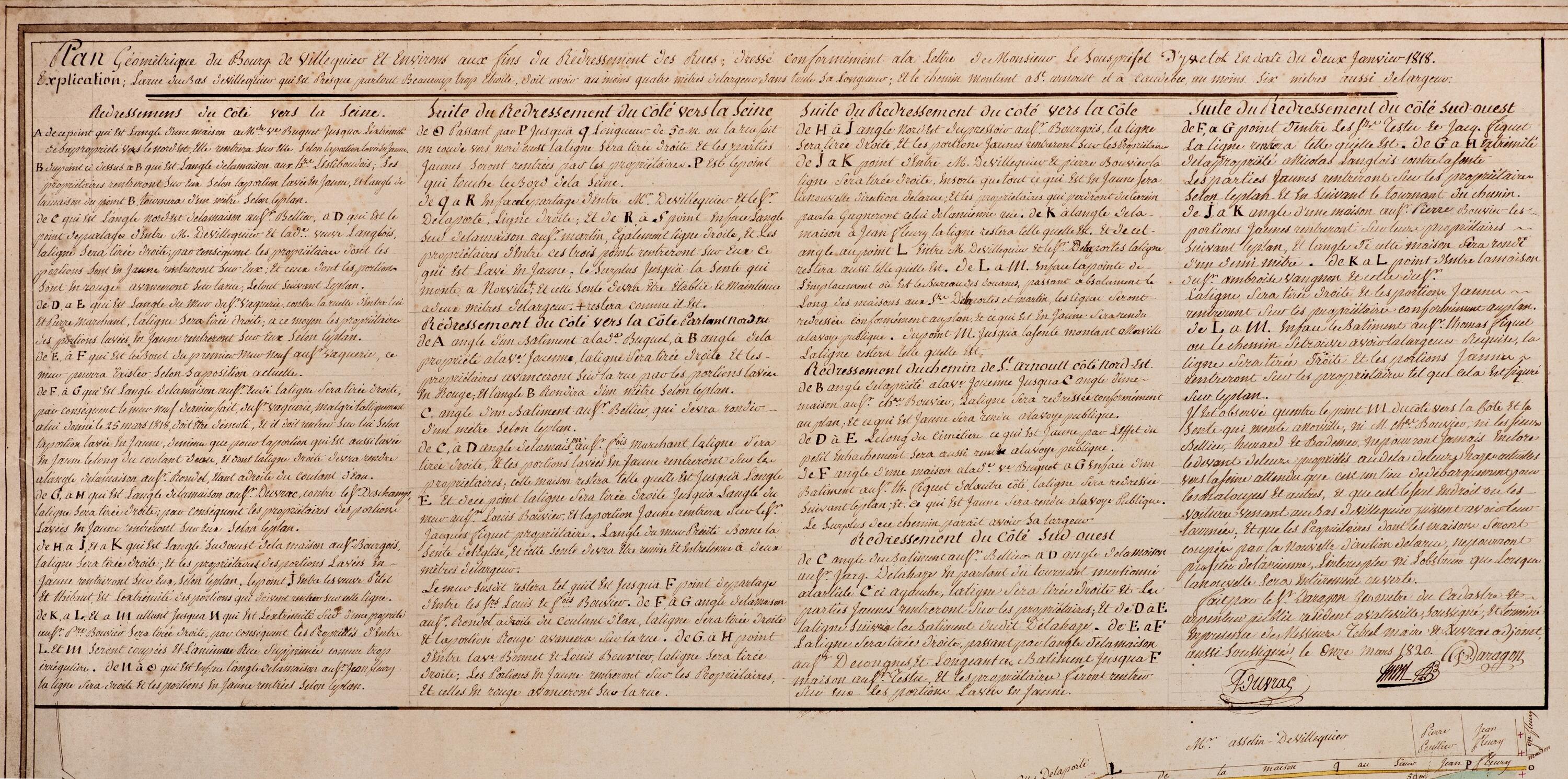 Plan géométrique du bourg de Villequier destiné au redressement des rues, détail des explications.- Plan levé par M. Daragon, géomètre du cadastre et arpenteur public, 11 mars 1820 (Archives communales de Rives-en-Seine).Immatriculation