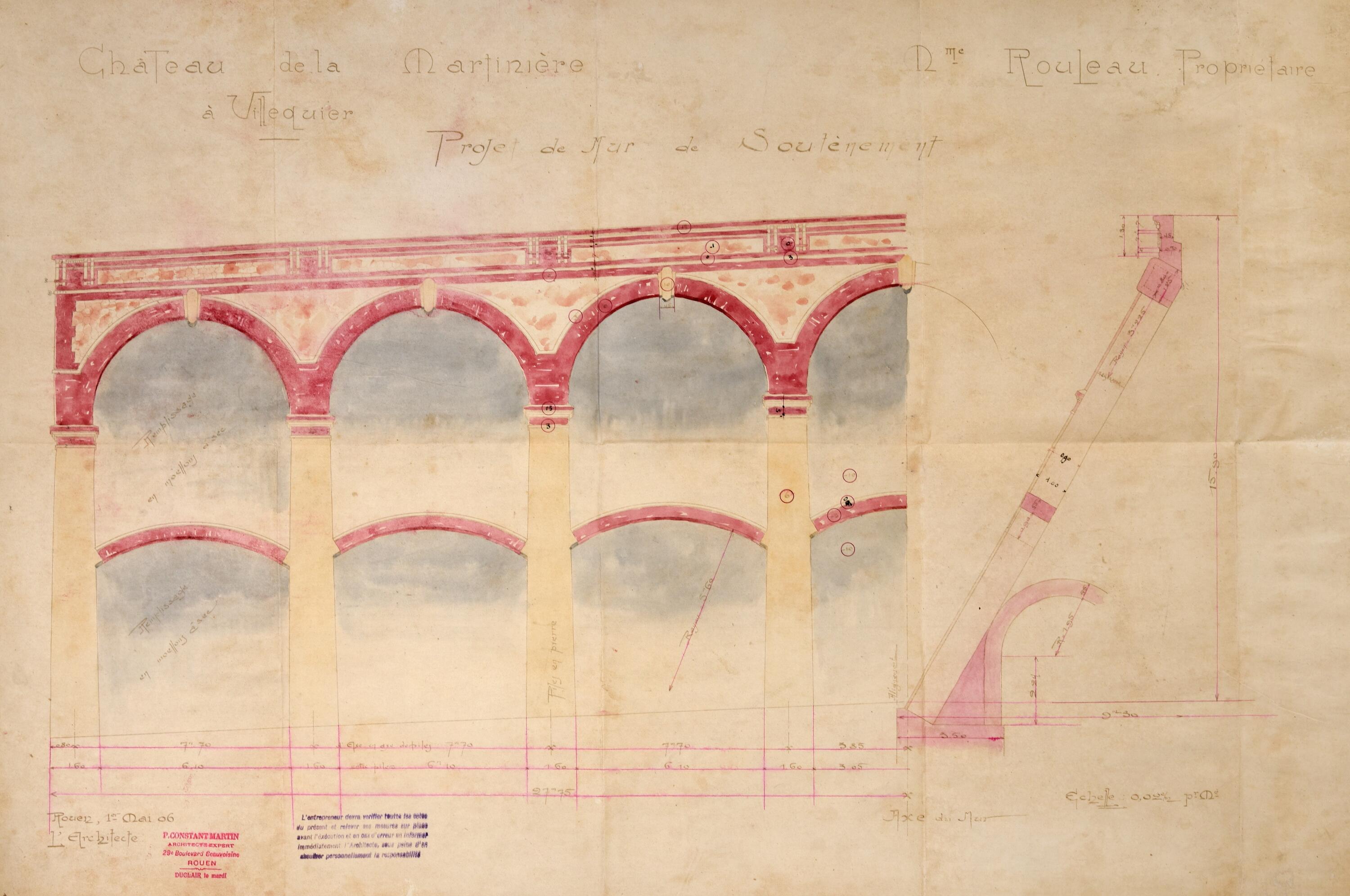 Projet de mur de soutènement.- Plan aquarellé dressé par P. Constant Martin, architecte à Rouen, 1er mai 1906 (Collection particulière).Immatriculation